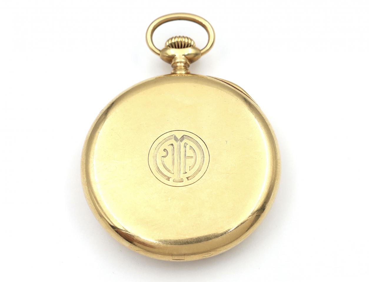 Tiffany & Co. 18kt yellow gold pocket watch, circa 1915. An antique pocket watch featuring a white enamel face, black arabic numerals, cognac minute and hour hands and a seconds dial, all to a 18kt yellow gold case, decoarated to the reverse with intricately engraved insignia, encasing a mechanical 21 jewel movement signed Ed Koehn.