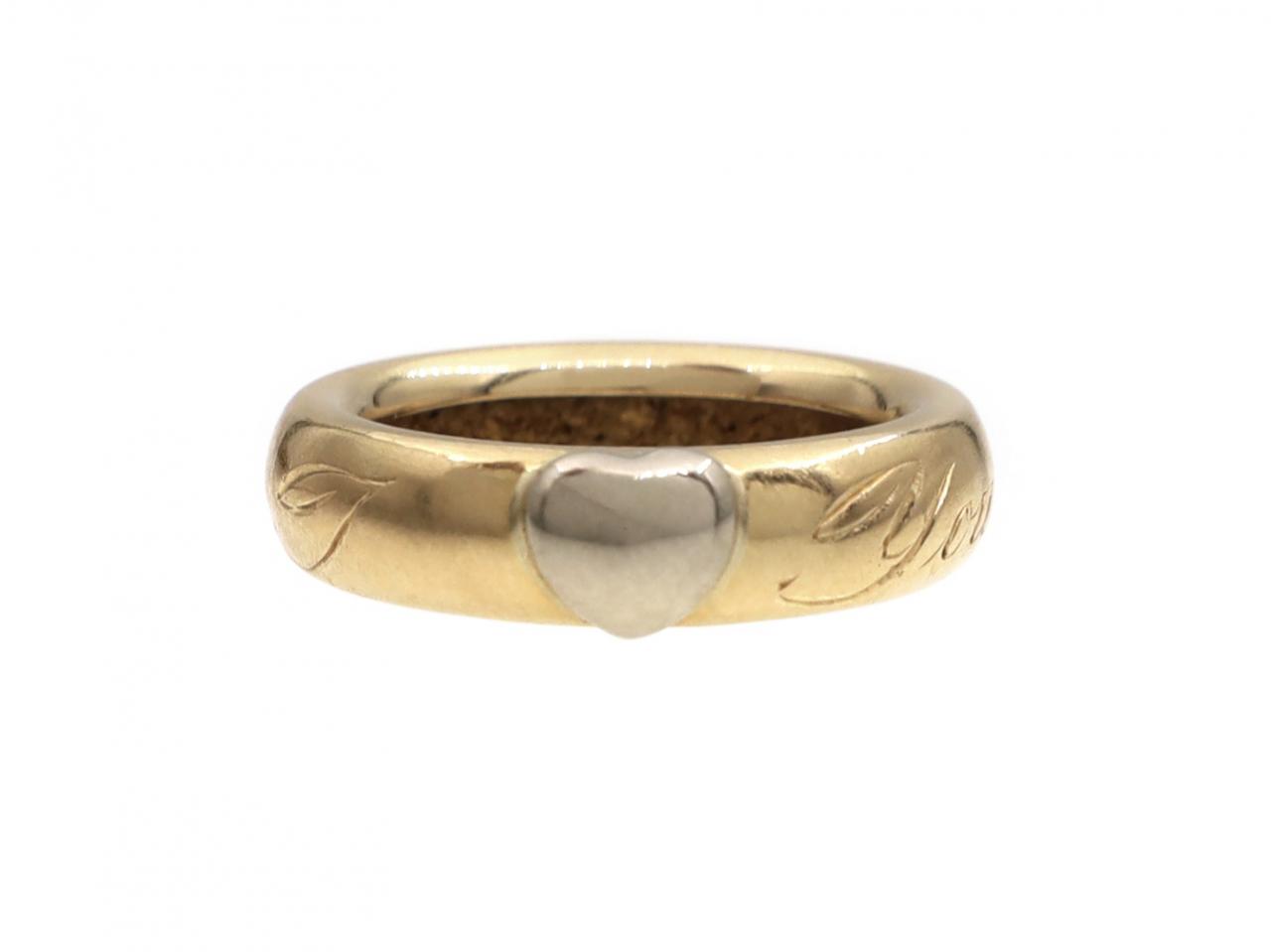 Tiffany & Co. 1993 'I LOVE YOU' dome ring in 18kt yellow gold. A 5mm domed band centred with a white gold heart flanked to either side with the words 'I' and 'YOU' so that the ring reads 'I LOVE YOU'. Marked 18kt gold, 1993. Signed 'TIFFANY & Co.'
