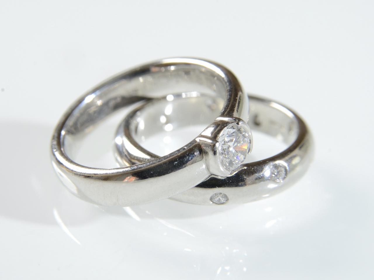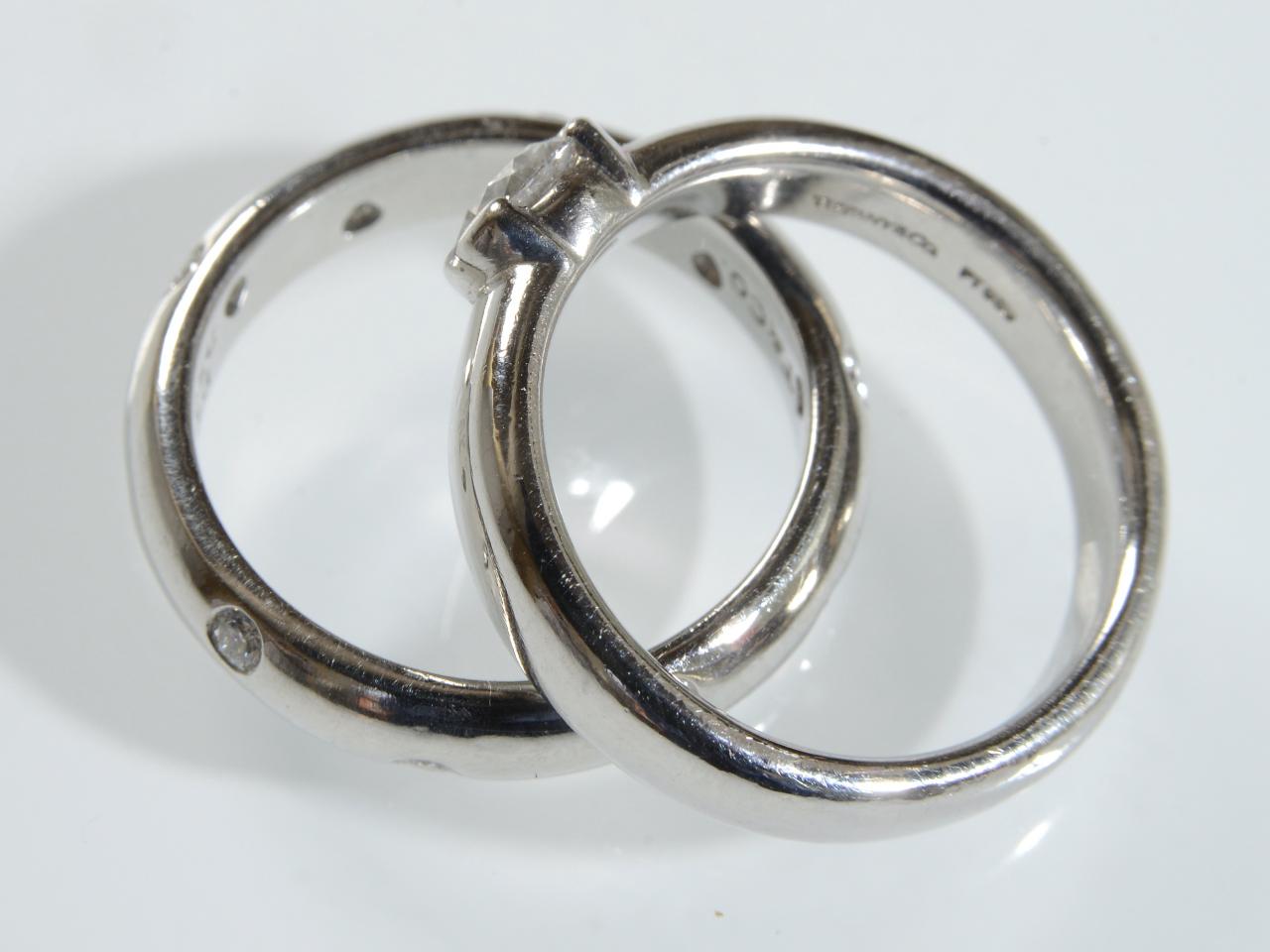 Tiffany & Co. diamond bridal set in platinum, consisting of an authentic Tiffany & Co. platinum and diamond engagement ring. The centre stone is beautifully cut and is stamped as 0.41cts on the inside of the band. This diamond is est. G/H in colour and VVS in clarity. The wedding band is a Tiffany & Co. "Etoile" ring with sporadic round brilliant cut diamonds set around the full circumference of the band in rubover settings. Marked platinum. Signed 'Tiffany & Co.'.
