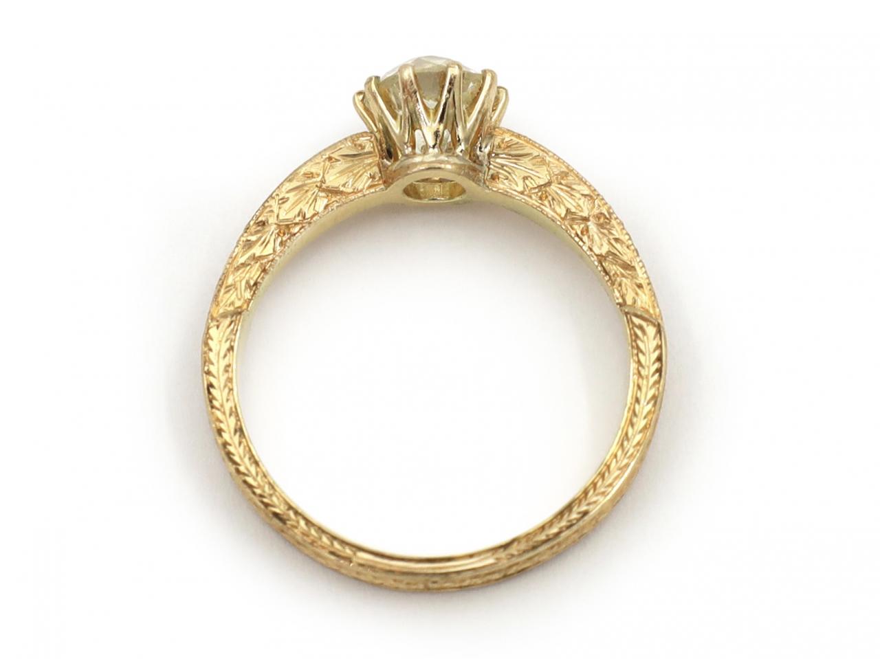 Victorian 1.05ct Old European cut diamond solitaire in 18kt yellow gold. Set with an estimated 1.05ct round Old European cut diamond in a slightly raised claw setting, to an elaborately carved solitaire design, flanked to either side with intricate engraved patterns of ivy leaves to the outer and inner, tapering and then broadening to a repeated carved wreath with linear frames and engraved wreath inner. Tested 18kt gold.