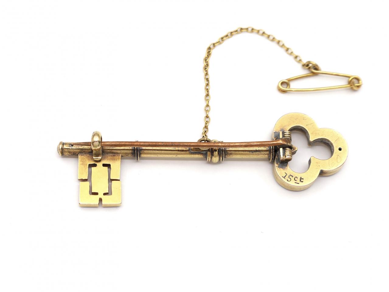 Victorian 15kt yellow gold trefoil key brooch set with pearls. Marked 15kt gold.