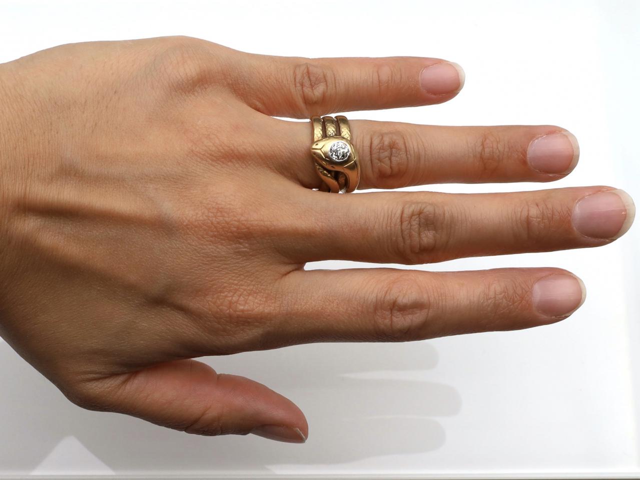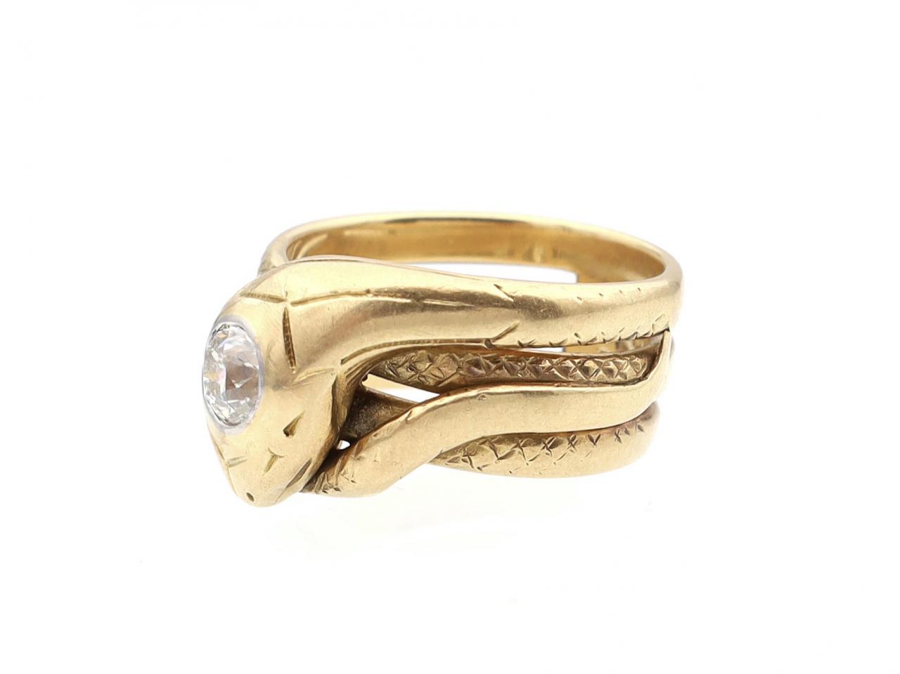 Victorian 18kt yellow gold and diamond serpent ring. A chunky sinuous serpent ring with three spiralling rows, each subtly textured with scales and terminating to each end with a tail and a large diamond set head. Hallmaked 18kt gold, French.