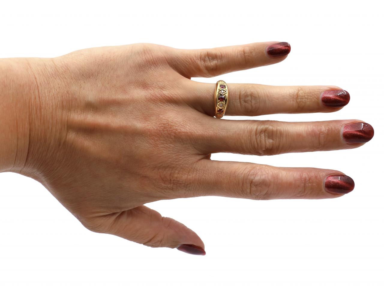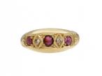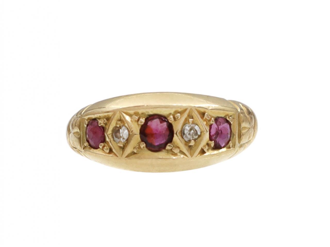 Victorian 18kt yellow gold diamond and ruby five stone ring. Set across the finger with alternating three round mixed cut rubies and two eight cut diamonds in stylised grain settings, to a gypsy ring design with polished borders and flanked to either side with decorative shoulders that taper to a solid shank. Hallmarked 18kt gold, London.