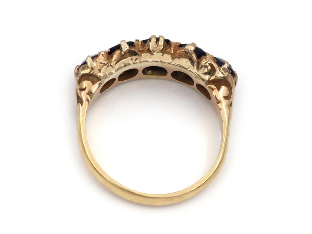 Victorian 18kt yellow gold five stone sapphire carved ring. Set across the finger with five cushion shape mixed cut sapphires in claw settings, to a graduating five stone design with bespoke claws, intricately carved gallery and decoratively engraved trumpeting shoulders which smooth to a solid shank.