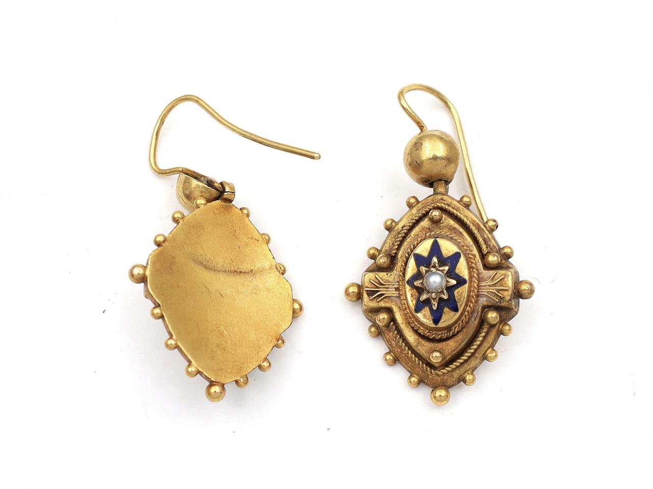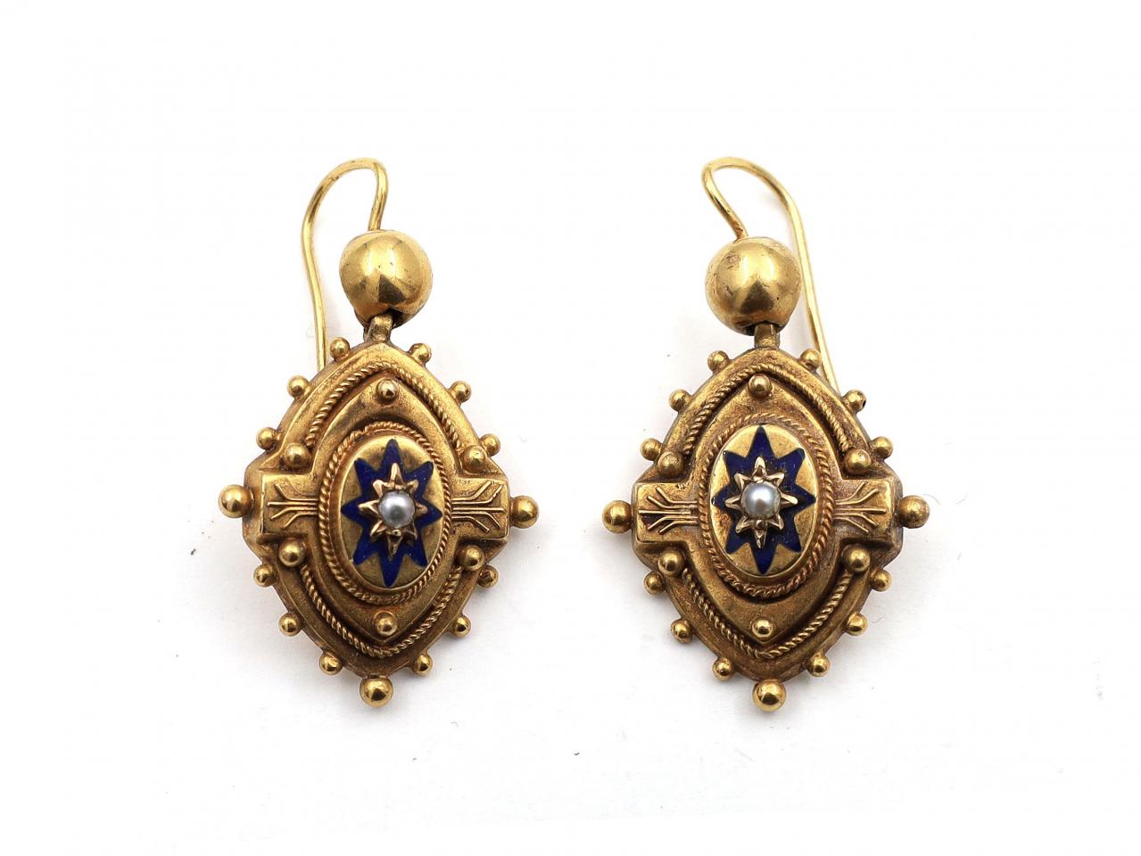 Victorian 18kt yellow gold pearl set star drop earrings. A matching pair of earrings, each consisting of a rounded navette drop centred with a gypsy set pearl framed by an eight pointed blue enamel star motif, further framed by elaborate rope twist and granulation work, all suspended from an articulated hollow spherical surmount fitted to reverse with a secure hook fitting.