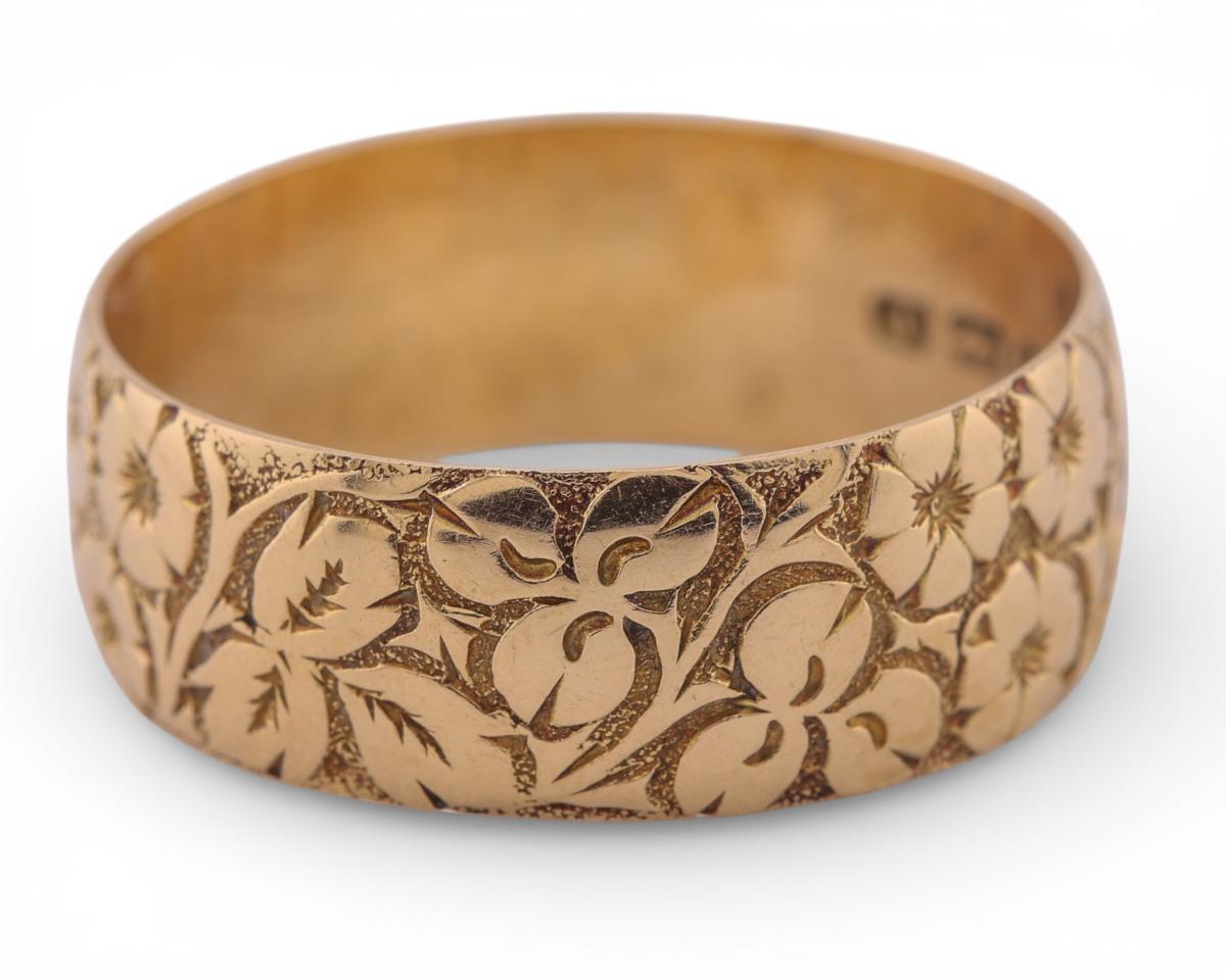 A wide Victorian wedding band in 9ct rose gold featuring all-over hand-chased floral and foliate engraving. The design shows forget-me-not flowers with leaves and scrollwork against a stippled ground. Hallmarked inside the band. Size Q