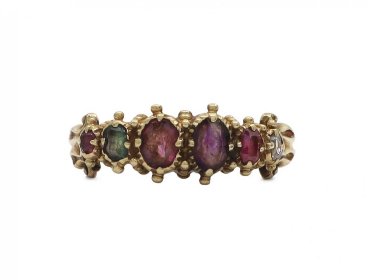 Victorian acrostic 'REGARD' ring in 15kt yellow gold. Set across the finger with a cushion shape mixed cut ruby in a claw setting, a cushion shape mixed cut emerald in a claw setting, an oval mixed cut garnet in a claw setting, an oval mixed cut amethyst in a claw setting, a cushion shape mixed cut ruby in a claw setting and a elongated cushion shape old cut diamond in a claw setting, to a six stone ring with intricate settings, granule decoration, enclosed gallery and carved scrolling shoulders which smooth to a solid shank.