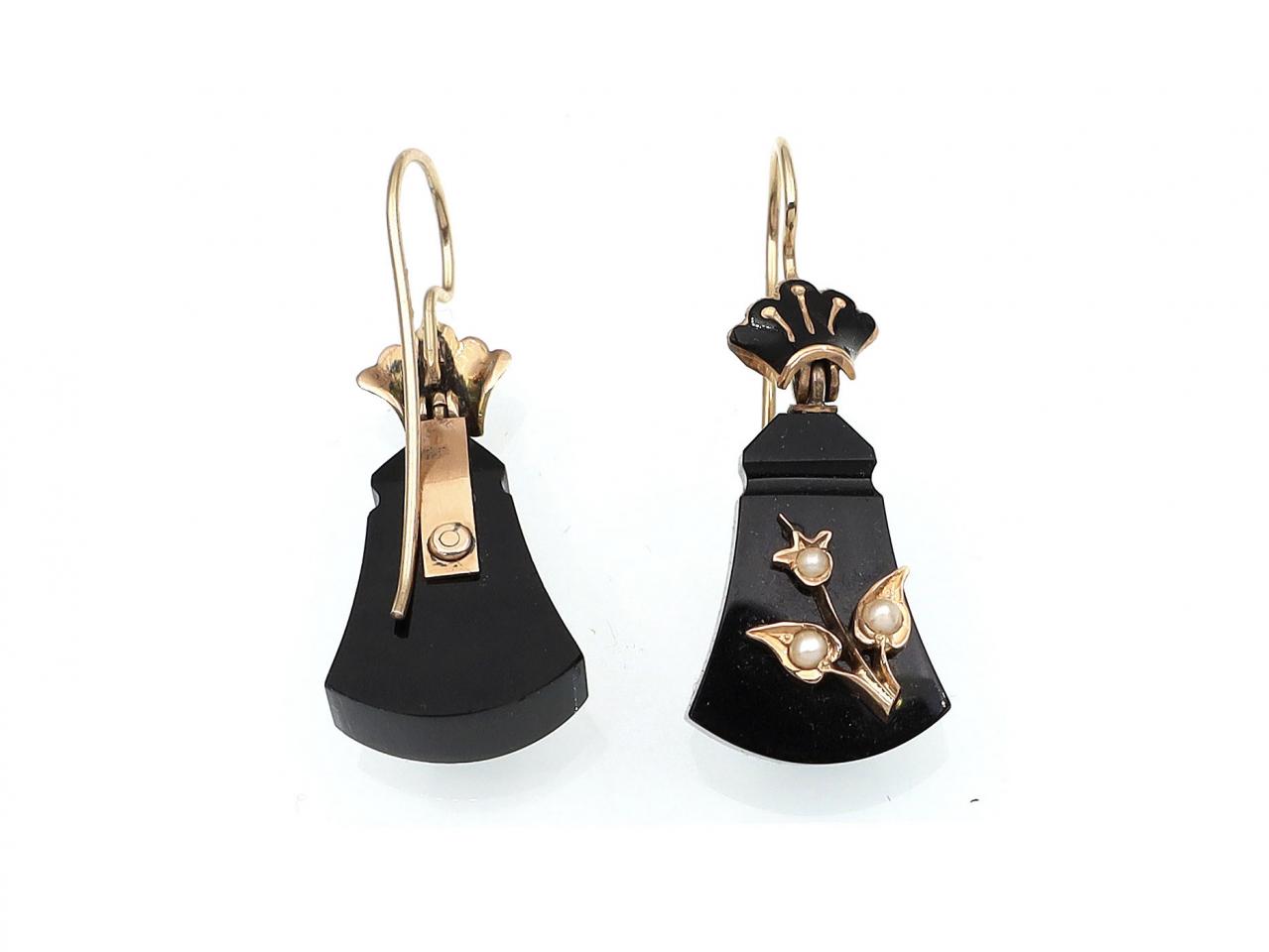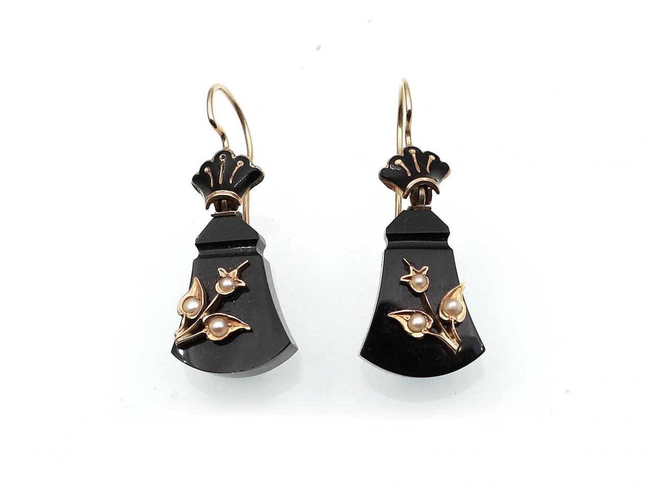 Victorian black onyx, enamel, pearl and yellow gold drop earrings. A matching pair of earrings, each consisting of a stylised carved trapezoid drop decorated to centre with a floral motif with leaves in yellow gold set with pearls, suspended from a flaring fluted crown surmount with black enamel finish and fitted with a secure hook.