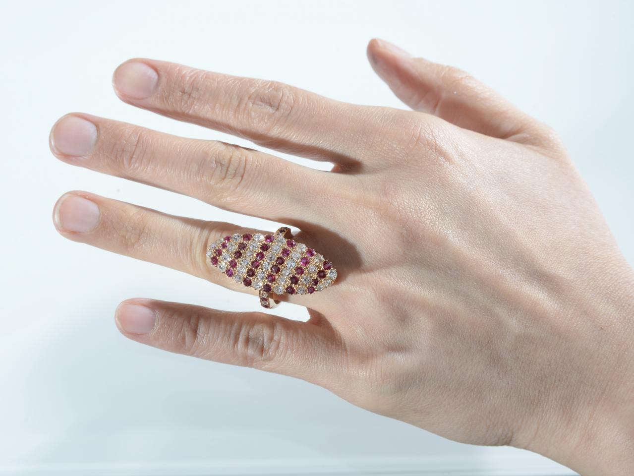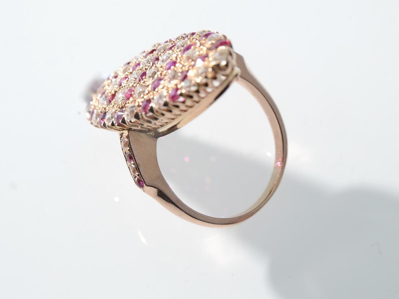 Victorian Burmese ruby and diamond marquise cluster ring in 18kt rose gold, a large marquise cluster ring set diagonally with round Old European cut diamonds in claw and grain settings, alternating with rows of round mixed cut Burmese rubies in claw and grain settings, fitted with diamond and Burmese ruby set shoulders which terminate to a three dimensional chevron design that smooths to a solid shank. Estimated total diamond weight 2.00cts.
