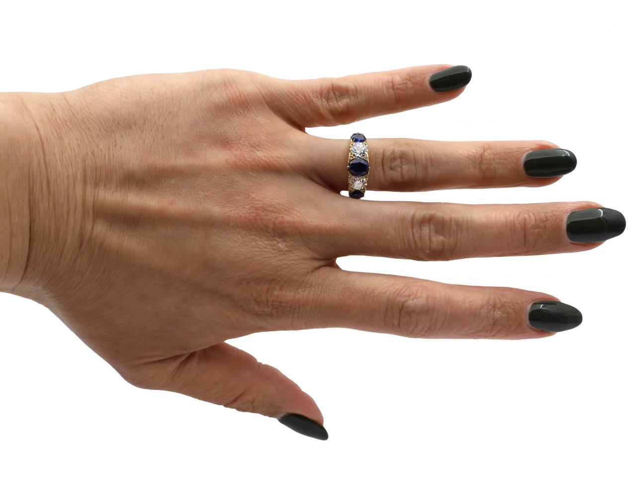 Victorian carved sapphire and diamond five stone ring in 18kt yellow gold. Centred with an oval mixed cut sapphire in a claw setting, flanked by two round old cut diamonds in claw settings, further set to either side with two cushion shape mixed cut sapphires in claw settings, to a five stone carved ring featuring stylised claws, rose cut diamond enbellishments, ornately carved gallery with scrolling motifs and met to either side with integrated carved shoulders which taper to a solid shank.