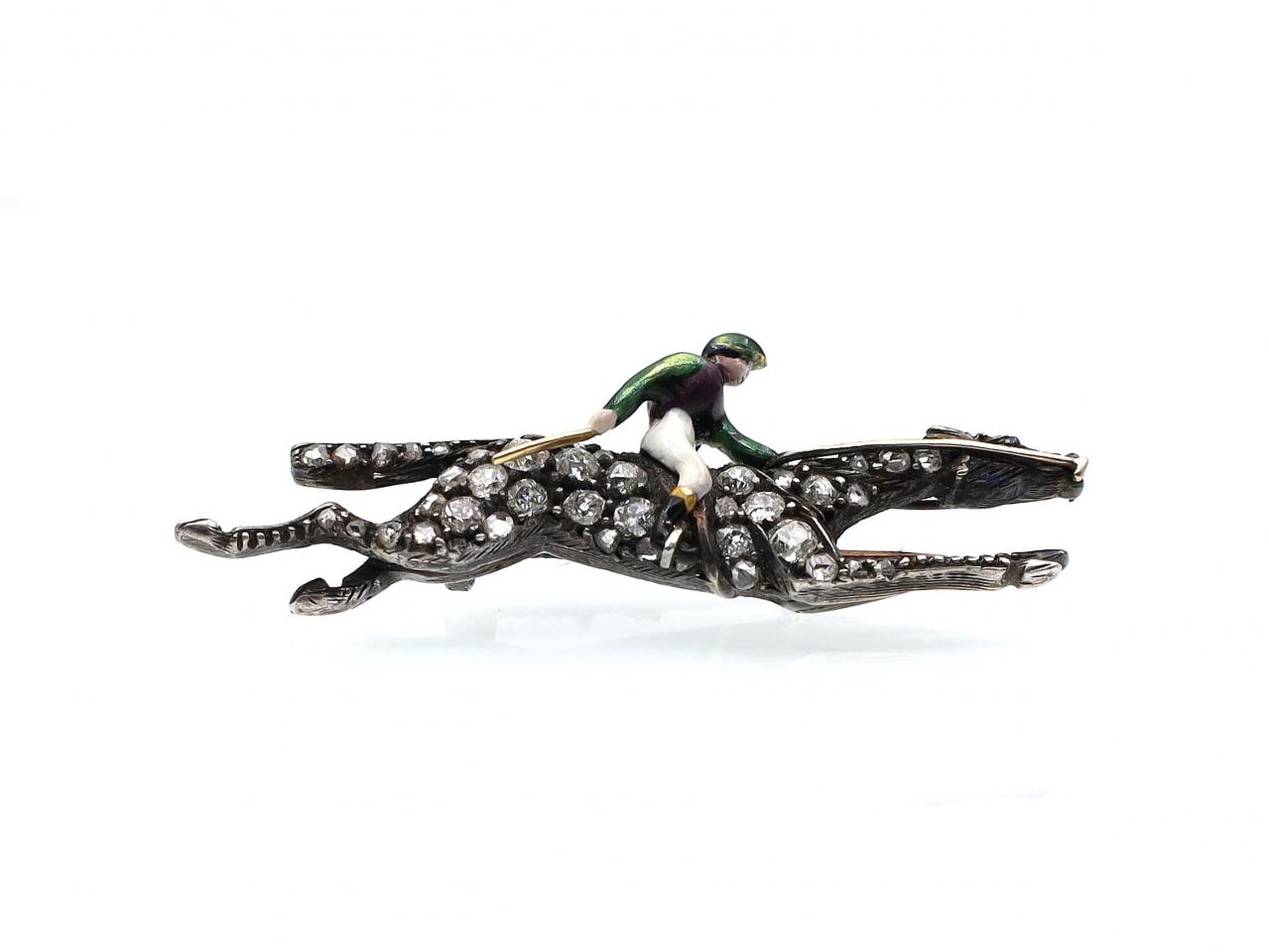 Victorian diamond and enamel horse and jockey brooch in silver on rose gold.