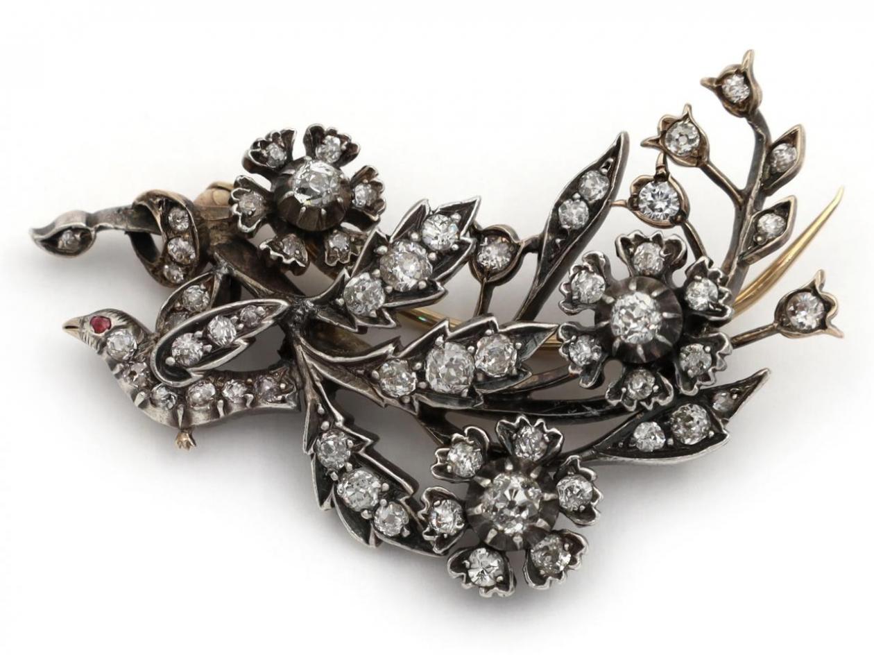 Victorian diamond and ruby bird and floral spray brooch in silver and gold.