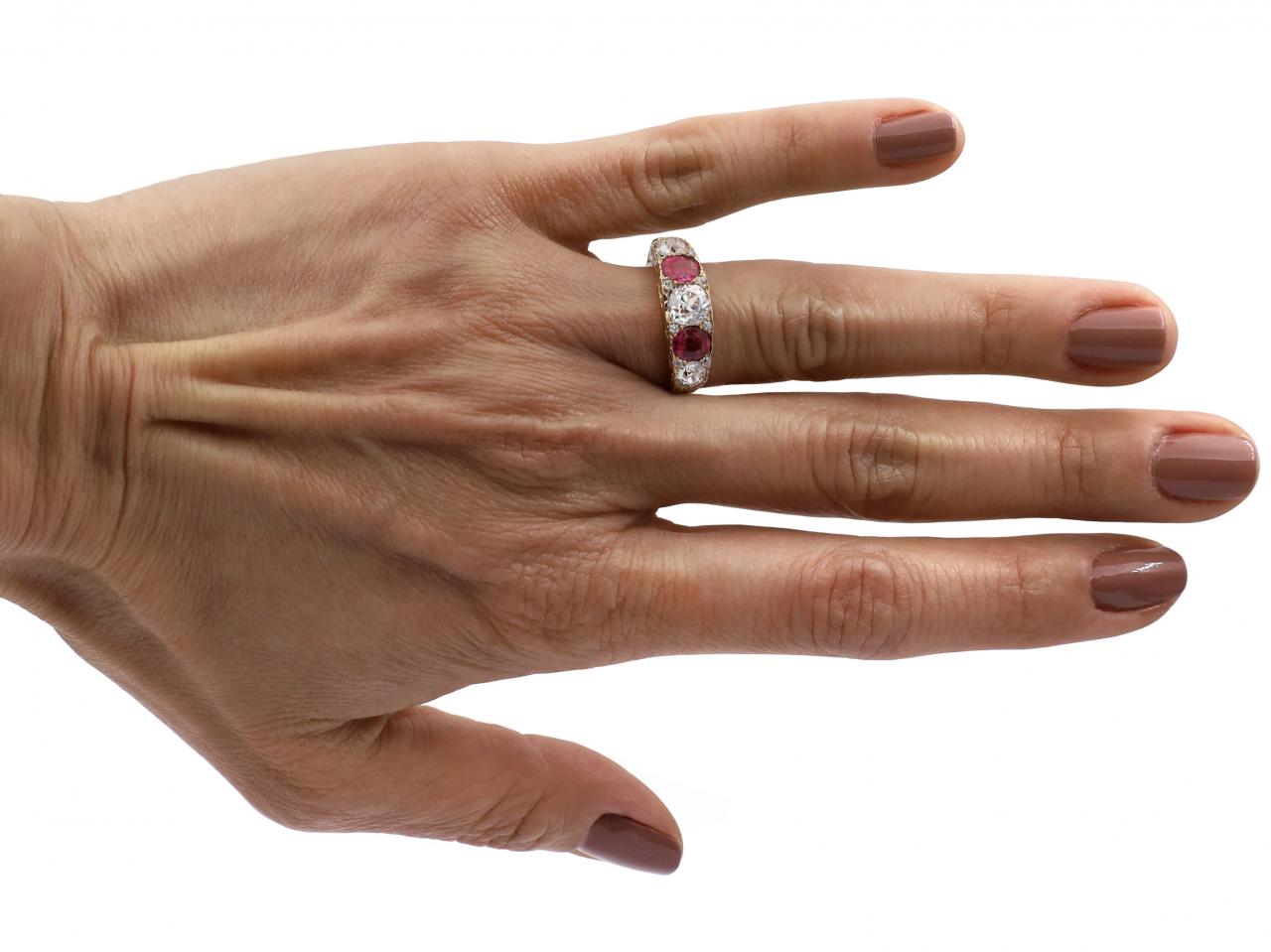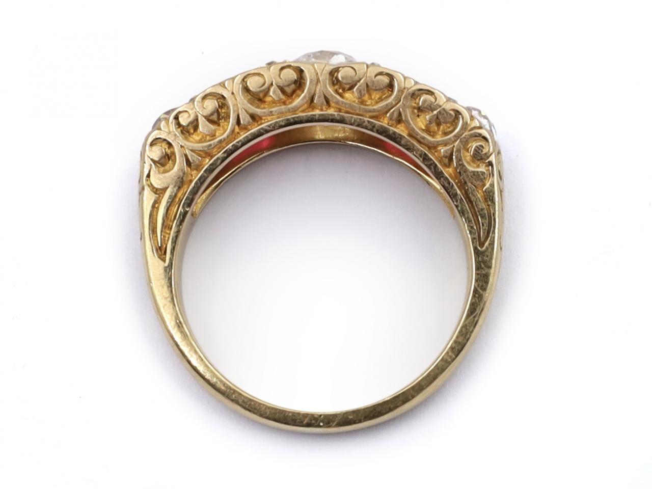 Victorian diamond and ruby five stone carved ring in 18kt yellow gold. Centred with a round Old European cut diamond in a claw setting, flanked to either side with two oval mixed cut rubies in claw settings, further set with two round Old European cut diamonds in claw settings, highlighted between each settings at top and bottom with eight round rose cut diamonds in grain settings, to a half hoop five stone ring featuring fine claws, carved scrolling gallery and shoulders which taper and terminate to a solid shank. Estimated total diamond weight 1.10cts. Estimated total ruby weight 1.10cts.