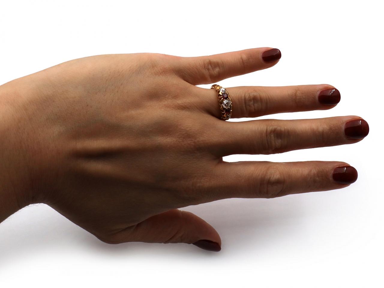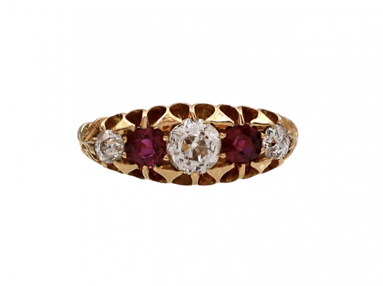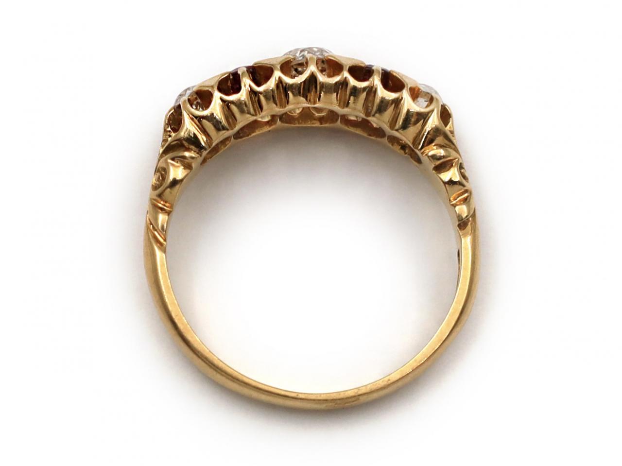 Victorian diamond and ruby five stone ring in 18kt gold. Set with three round Old European cut diamonds in claw settings, alternating with two round mixed cut rubies in claw settings, to a five stone graduating design with stylised claws and carved trumpeting shoulders which smooth to a solid shank.