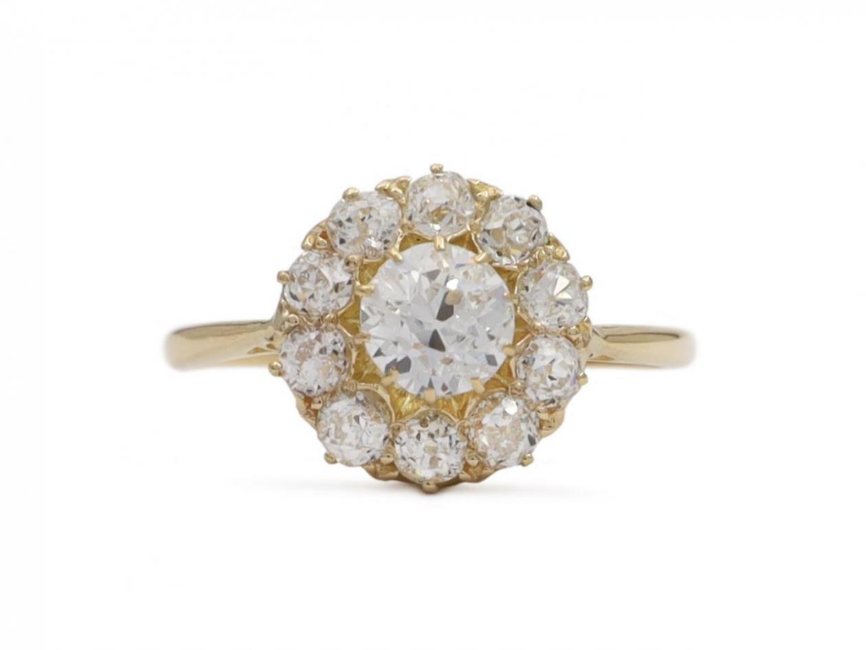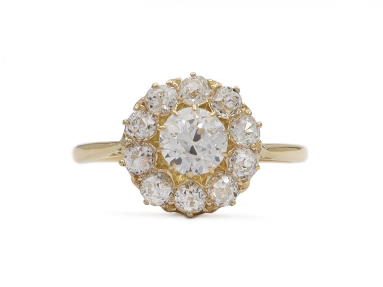 Victorian diamond coronet cluster engagement ring in 18kt yellow gold. Centrally set with an estimated 0.50ct round Old European cut diamond in a claw setting, encircled by ten round old cut diamonds in claw settings, to a circular cluster with fine claws, pierced gallery and flanked by raised inwardly tapering shoulders which flow to a solid shank. Estimated total diamond weight 1.10cts.