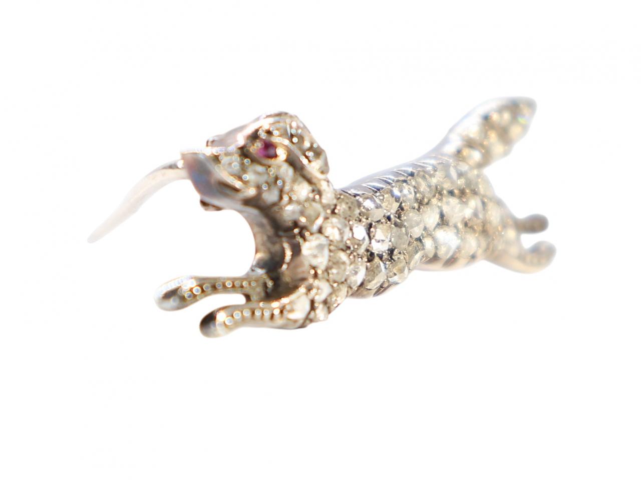 A delightful Victorian brooch depicting a running dog, most likely a greyhound or whippet, its body entirely pavé set with rose cut diamonds in silver, backed with gold. The dog is captured at full stretch with legs extended and ears flying back, perfectly conveying the speed and grace of a sighthound in motion. A cabochon ruby eye adds a flash of life to the piece. The legs and ears are set with smaller rose cuts in fine grain settings, while the body carries larger stones that catch light beautifully. The reverse shows the typical Victorian construction of silver over gold, with a simple pin fitting and C-catch. Dogs were popular subjects in Victorian jewellery, symbolising loyalty, fidelity and companionship. Greyhounds and whippets in particular appealed to the sporting set. This one has survived in excellent condition with all stones present and secure.
