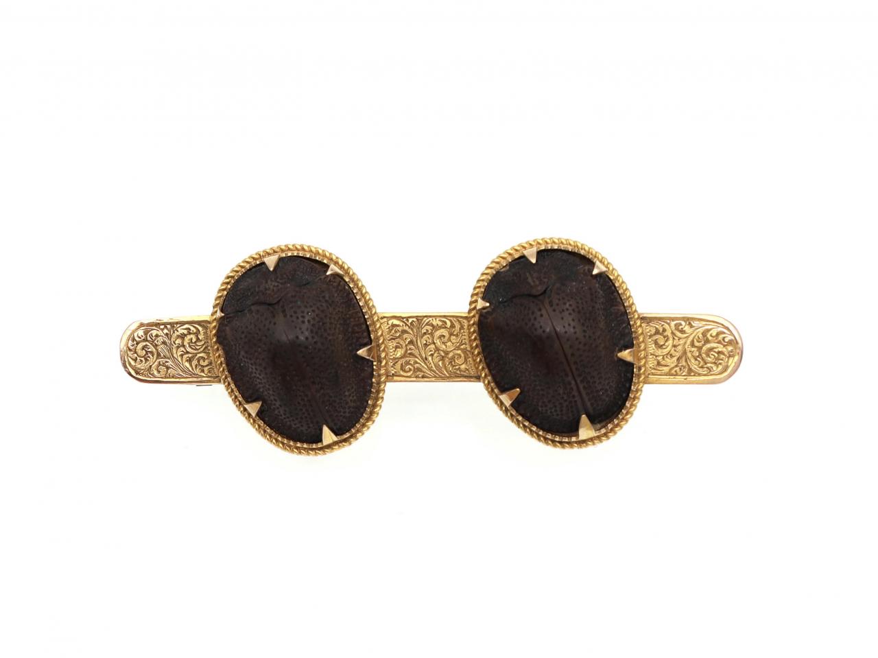 Victorian double brown beetle bar brooch in yellow gold. A fascinating brooch featuring two real beetle shells in claw settings with rope frames, on a wide decorative bar with floral etching, fitted to the reverse with a secure hinged pin and C-scroll. Marked 9kt gold.