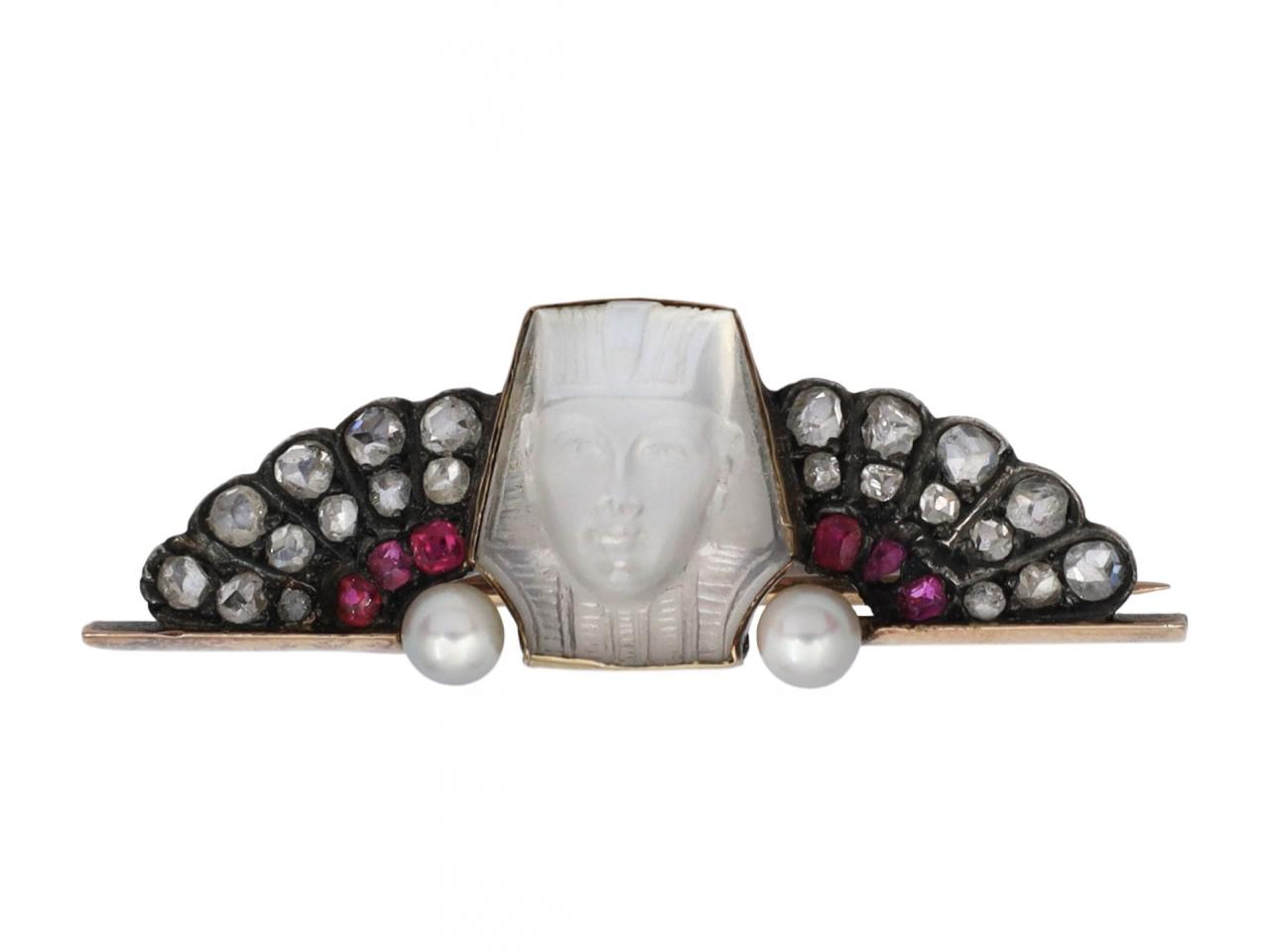 Victorian Egyptian revival winged pharaoh brooch in silver and gold. Centred with a moonstone carved in the form of a pharaoh's head in a rubover setting, flanked to the shoulders with two natural pearls, further enhanced to either side with two rows of round rose cut diamonds in silver cut down settings and a single row of round mixed cut rubies in silver cut down settings, to a rare Egyptian revival brooch, complete with pharoah head and scalloped wings, fitted to the reverse with a secure hinged pin and c-scroll. Accompanied by original antique box.