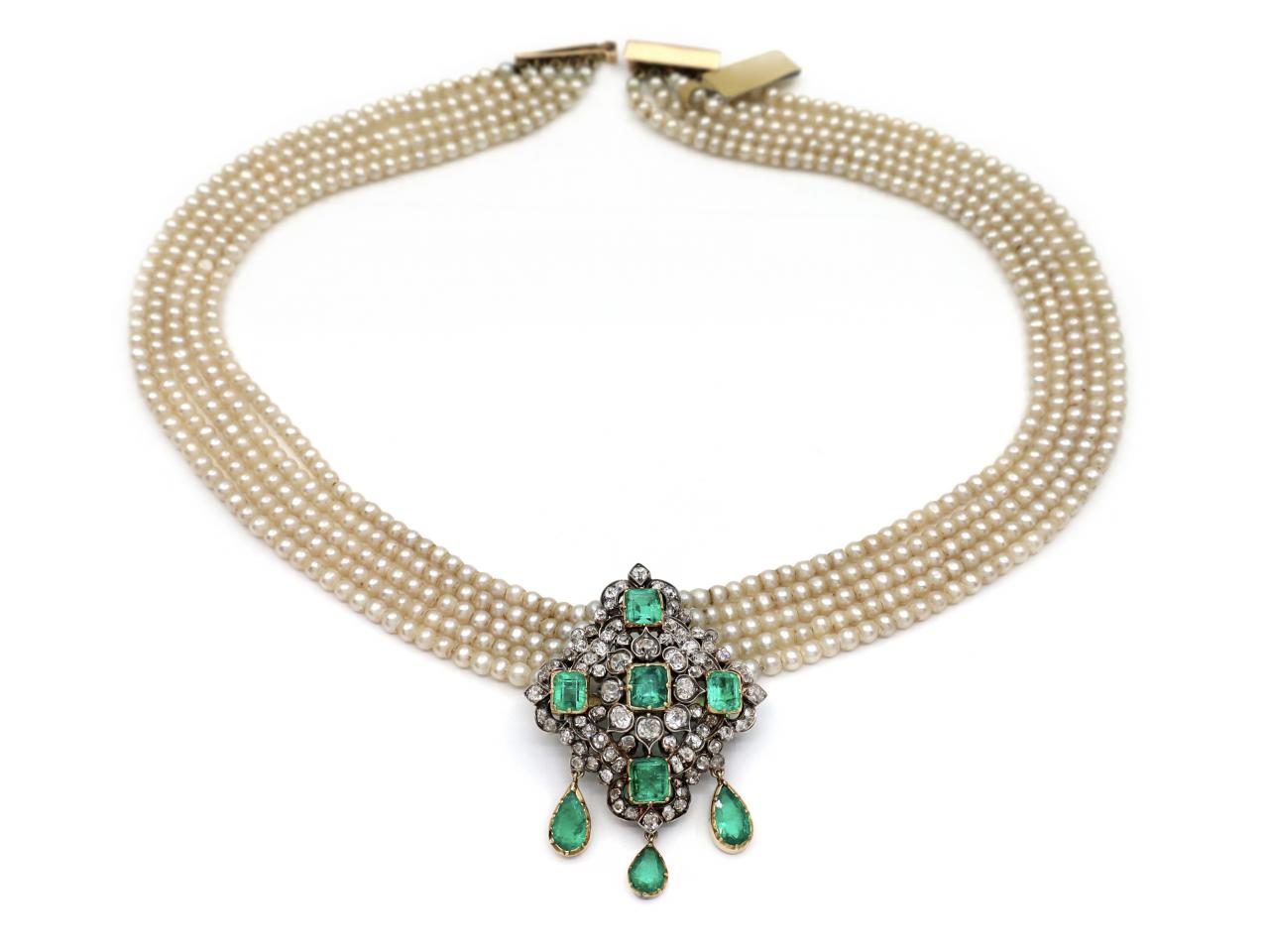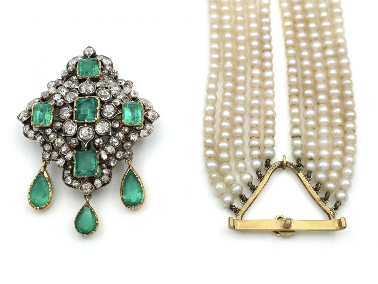 Victorian emerald and diamond convertible brooch and pearl necklace in silver and yellow gold.