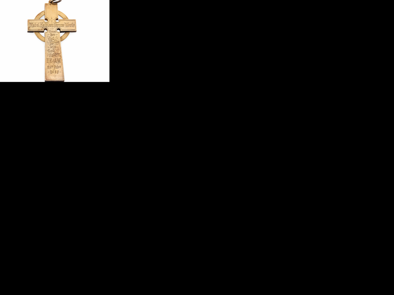 A Victorian Celtic high cross pendant dated 25th February 1880, with hand-engraved Celtic interlace knotwork to the front and a personal inscription to the reverse. The pendant weighs 11.55 grams and comes in what appears to be its original fitted blue velvet case.