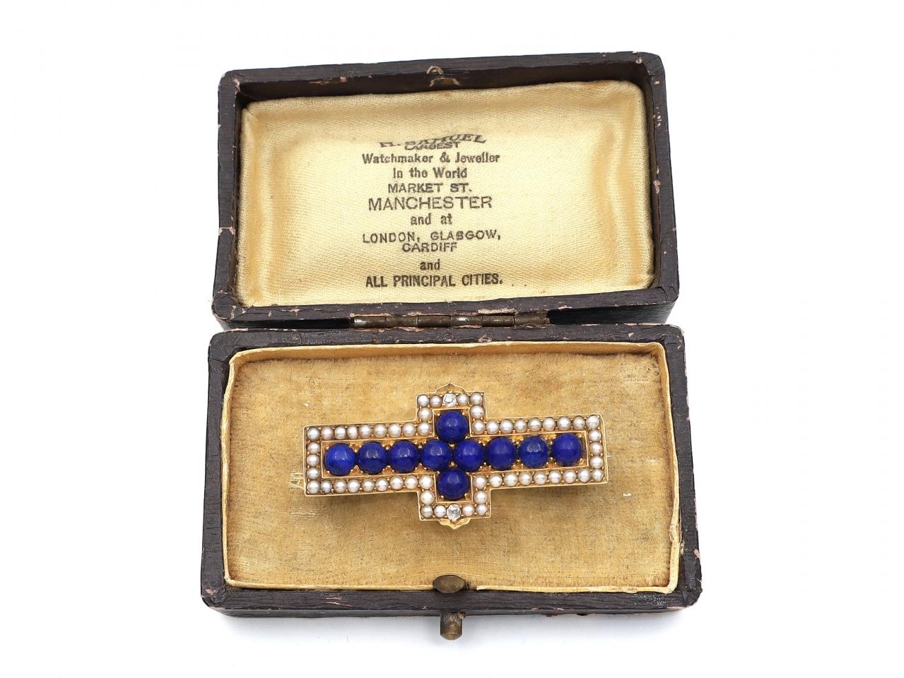 Victorian Lapis Lazuli, Seed Pearl & Diamond Cross Brooch