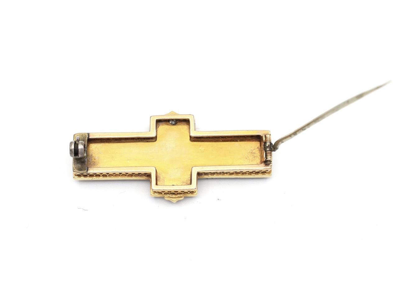 Victorian Lapis Lazuli, seed pearl and diamond cross brooch in 15kt yellow gold. Centred with round cabochon lapis lazuli bordered a row of white seed pearls in claw settings and further decorated with cushion shape old mine cut diamonds in claw settings, to a Greek cross motif with stylised claws, intricate borders and hatchwork gallery, fitted to the reverse with a hinged pin and clasp with safety mechanism.
