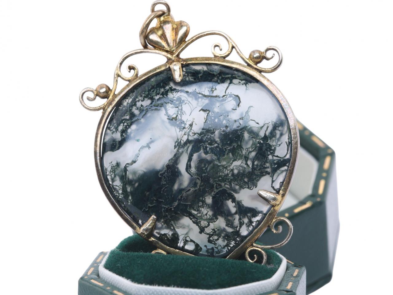 A Victorian pendant set with an oval moss agate panel, the translucent stone displaying attractive dendritic inclusions suggestive of natural landscapes. Mounted in a decorative gold frame with loop fitting. Gross weight 7.11 grams.