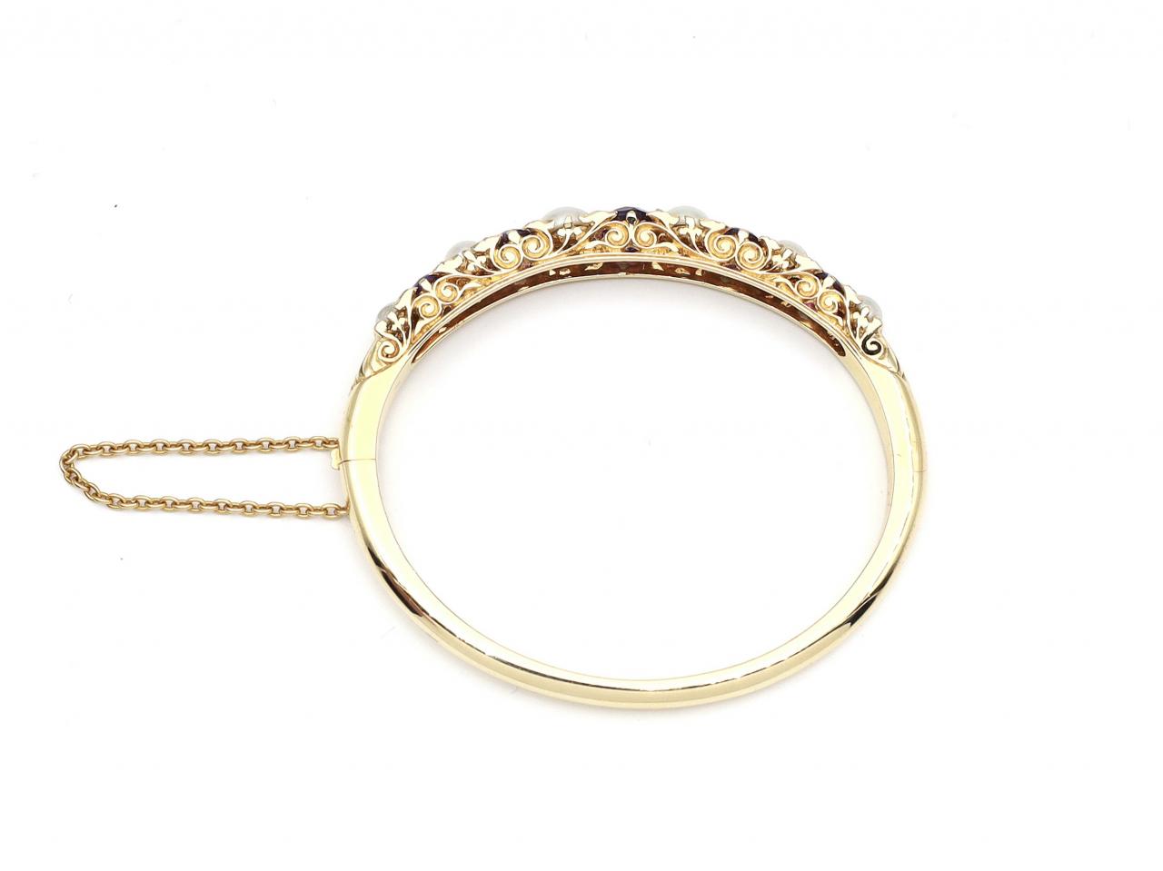 Victorian natural pearl, amethyst and diamond carved hinged bangle in 18kt yellow gold.