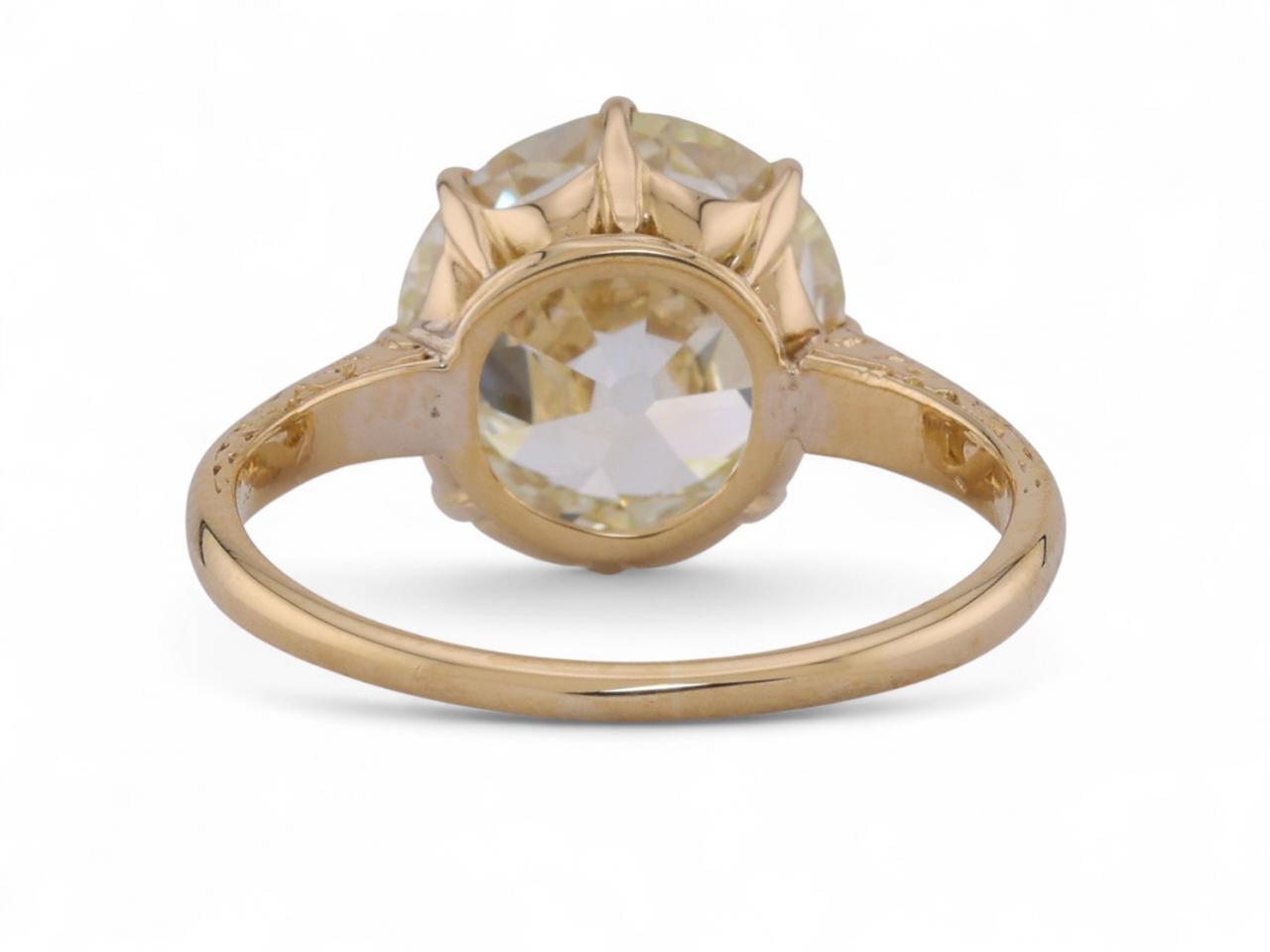 Victorian solitaire ring claw-set with an old European cut diamond estimated at 4.50ct, assessed as light yellow colour, VS clarity. Mounted in 18kt yellow gold.