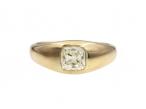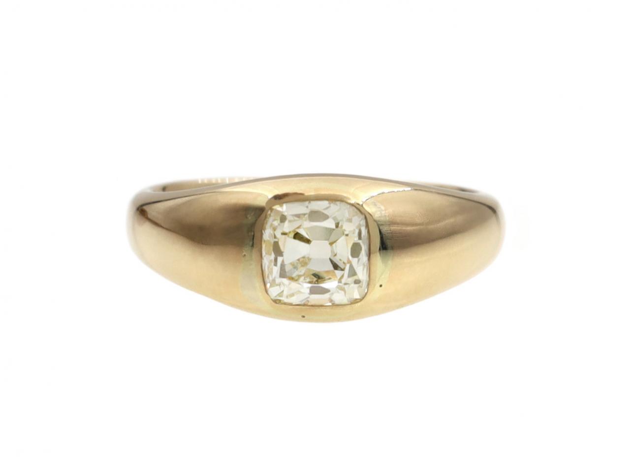 Victorian Old Mine cut diamond solitaire in 18kt yellow gold. Set with an estimated 1.00ct cushion shape Old Mine cut diamond in a rubover setting, to a smooth solitaire design featuring integrated trumpeting shoulders which taper to a solid shank. Hallmarked 18kt gold, London, 1889.