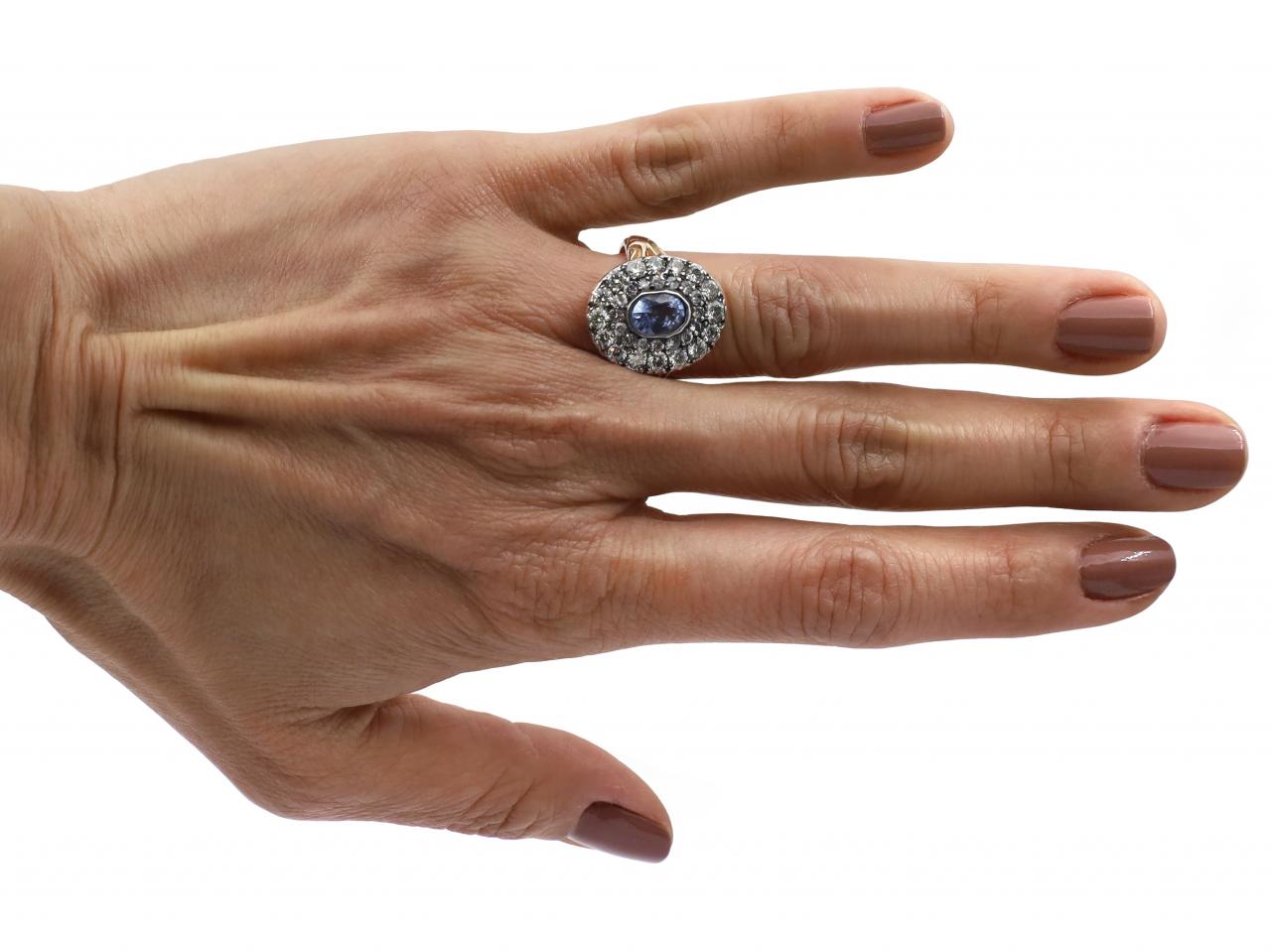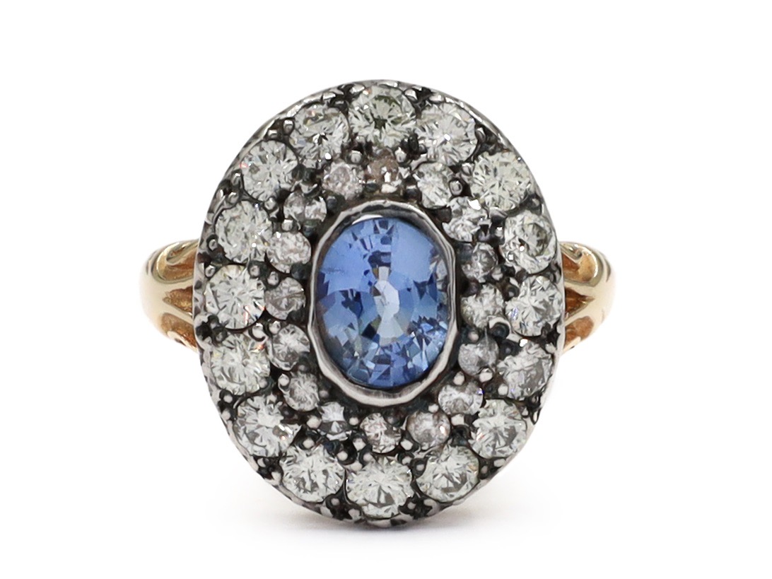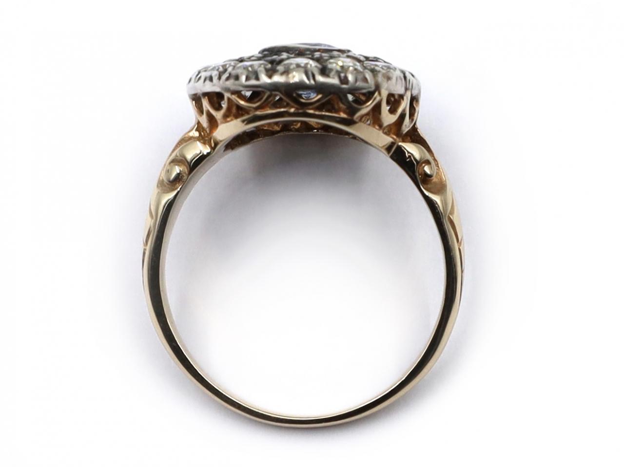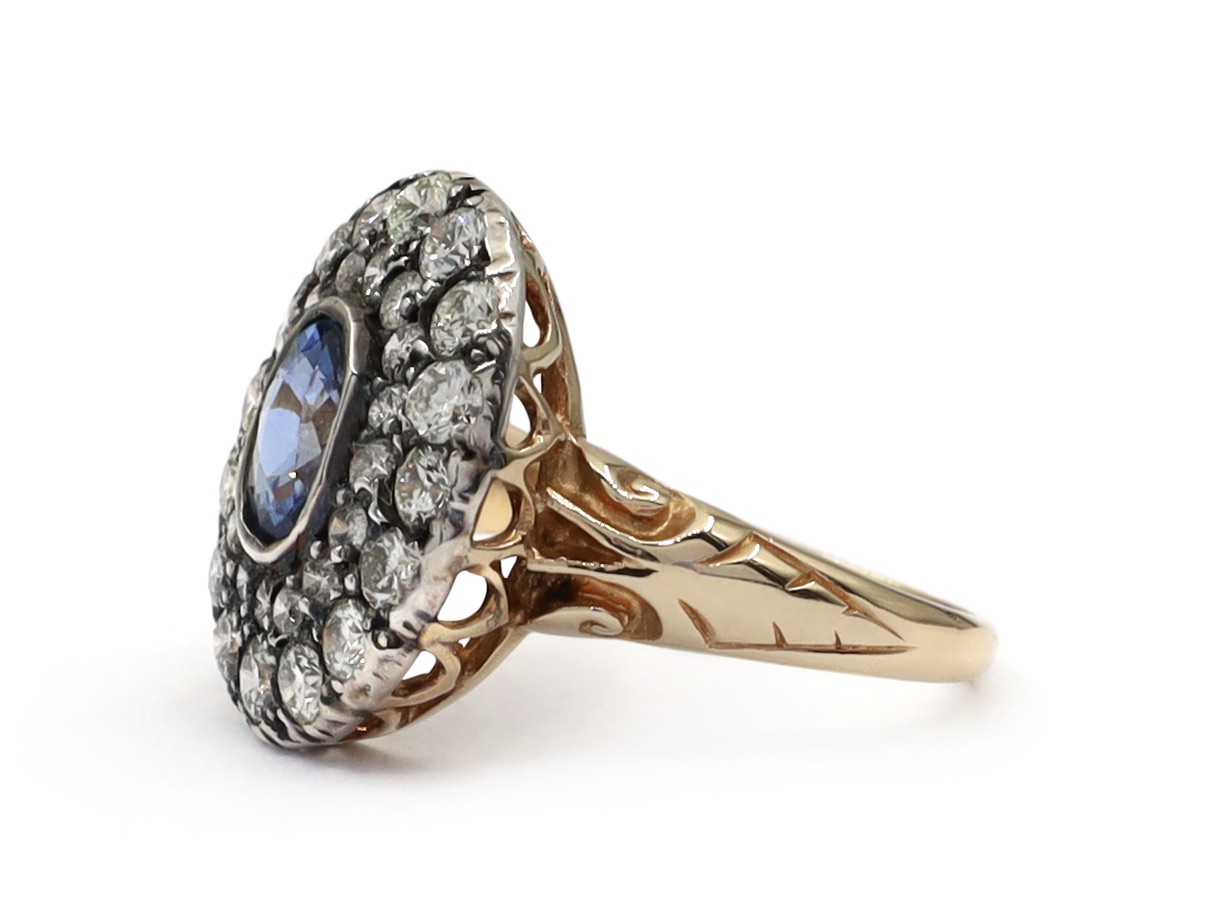 Victorian oval sapphire and diamond cluster ring set in silver on yellow gold. Centred with an oval mixed cut sapphire in a silver rubover setting, encircled by two gradusting rows of round old cut diamonds in silver grain and cut down settings, to an oval cluster design featuring smooth settings, scalloped and pierced gallery and flanked to either side with trumpeting carved shoulders which taper to a solid shank.