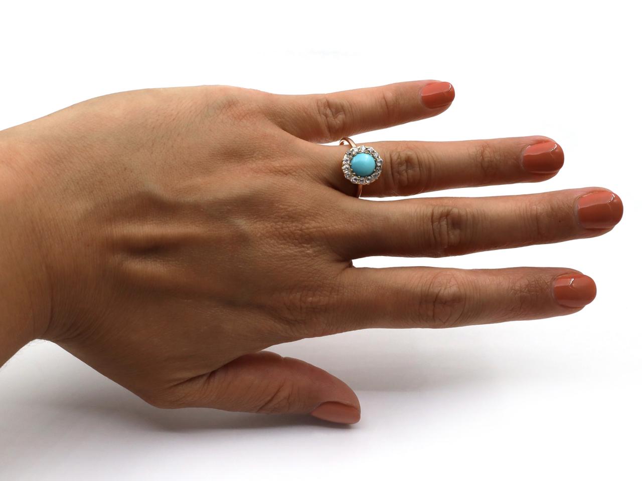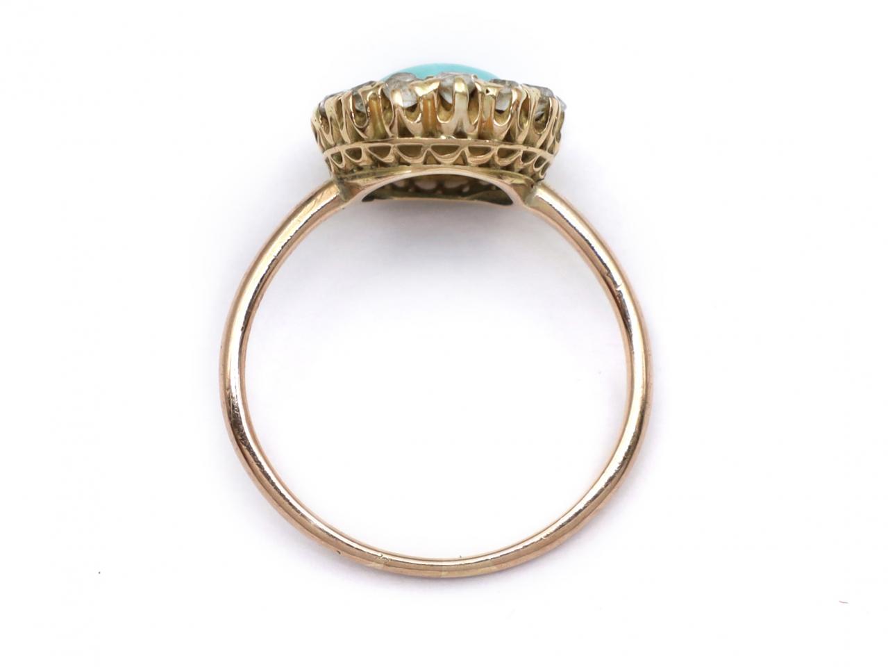 Victorian oval turquoise and diamond cluster ring in 18kt gold. Centrally set with an oval cabochon cut Persian turquoise in a yellow gold grain setting, framed by round Old European cut diamonds in claw and grain settings, to an oval cluster design with pierced gallery flanked by slim shoulders which flow to a solid shank.