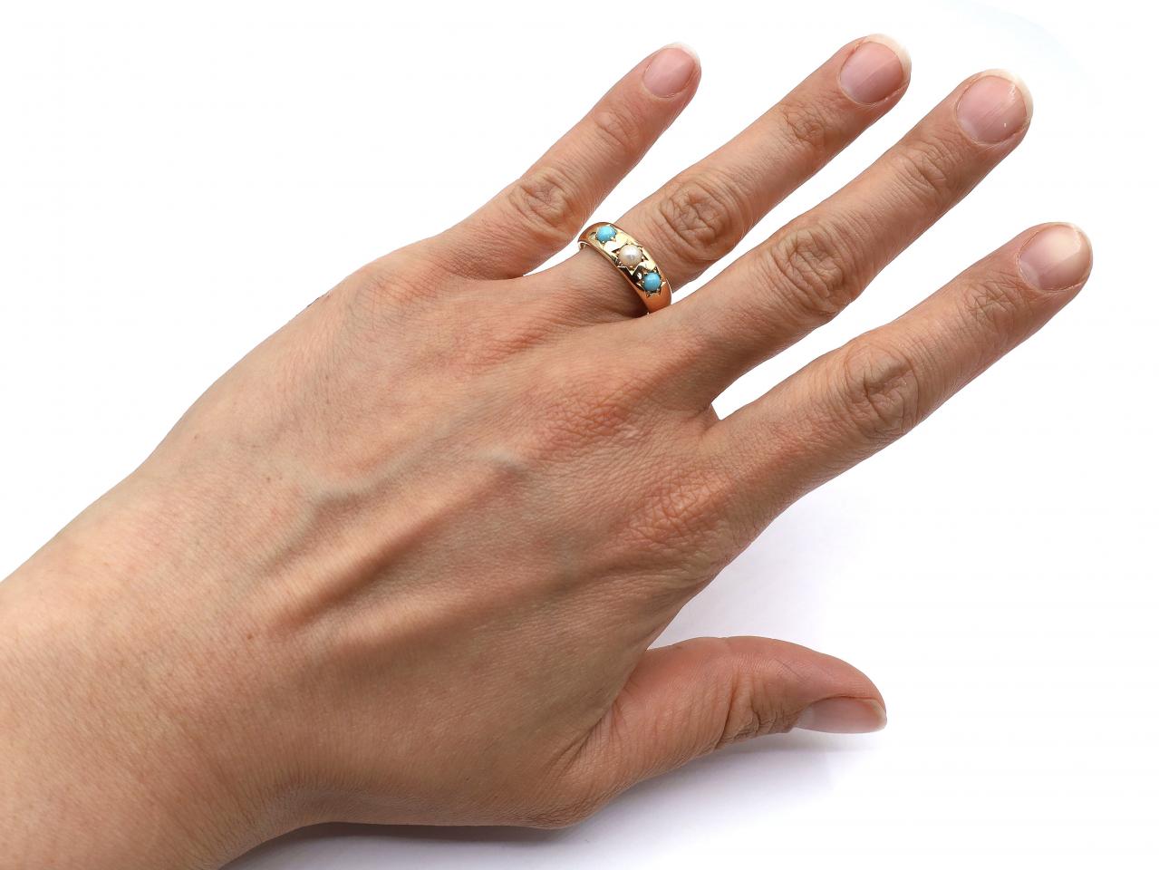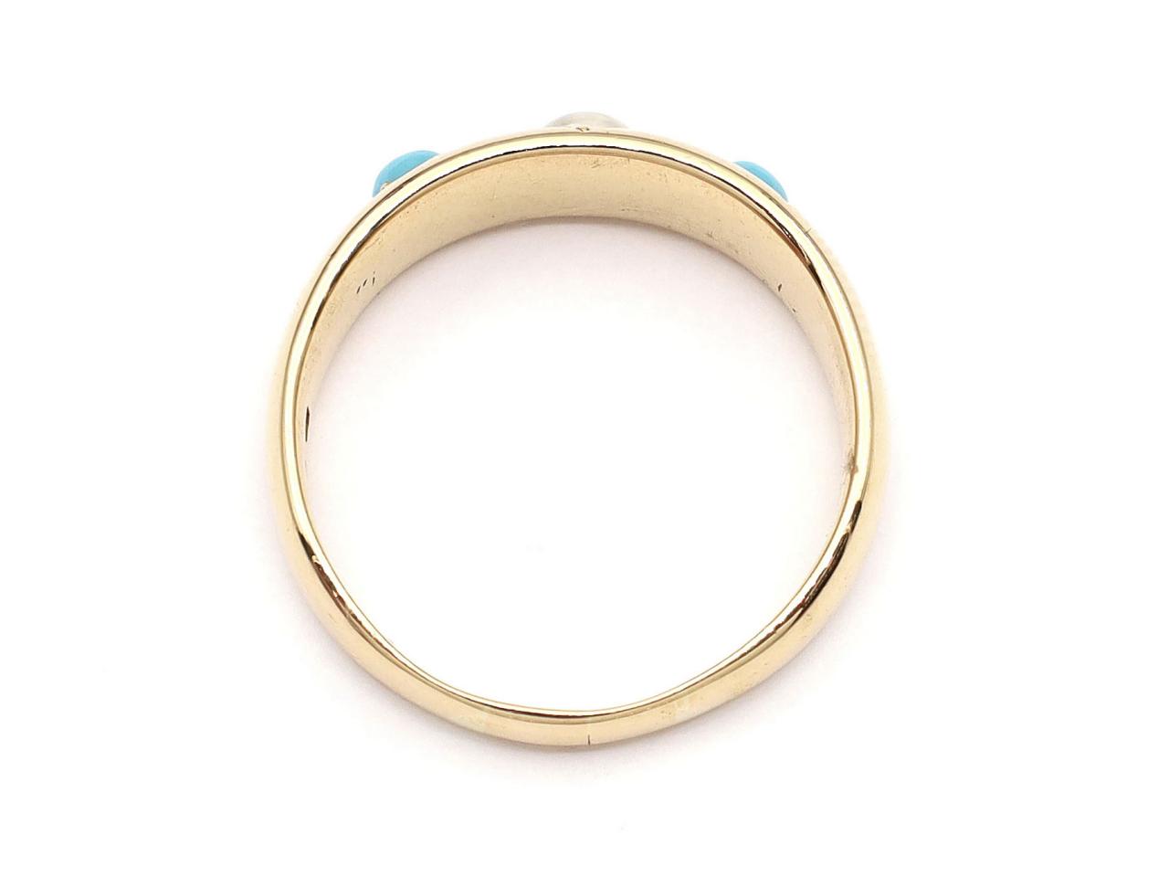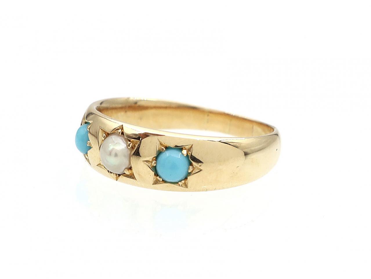 Victorian pearl and turquoise three stone gypsy ring in 18kt yellow gold. Centred with a natural pearl in a six pointed star gypsy setting, flanked by two round cabochon turquoise in six pointed star gypsy settings, to a polished three stone band which slightly tapers to the reverse. Hallmarked 18kt gold, Birmingham.