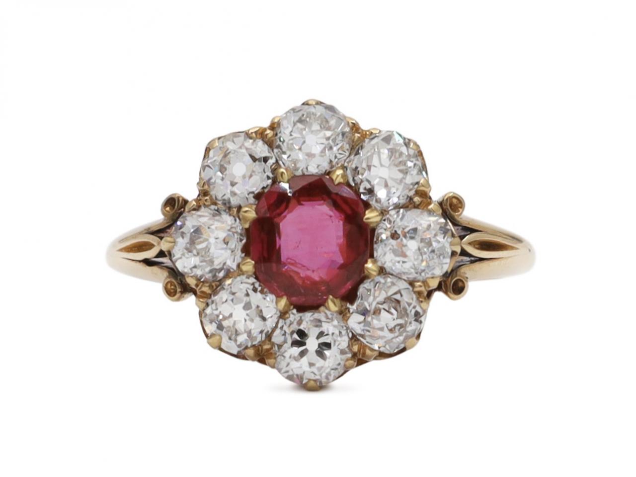 Victorian ruby and diamond circular cluster engagement ring in 18kt yellow gold. Centred with an estimated 0.60ct round mixed cut ruby in a slightly raised claw setting, framed by a row of eight round Old European cut diamonds in claw settings, to an elegant coronet cluster design with intricate claws, pierced gallery and tri-split trumpeting shoulders which curve to a solid shank. Estimated total diamond weight 1.40cts.