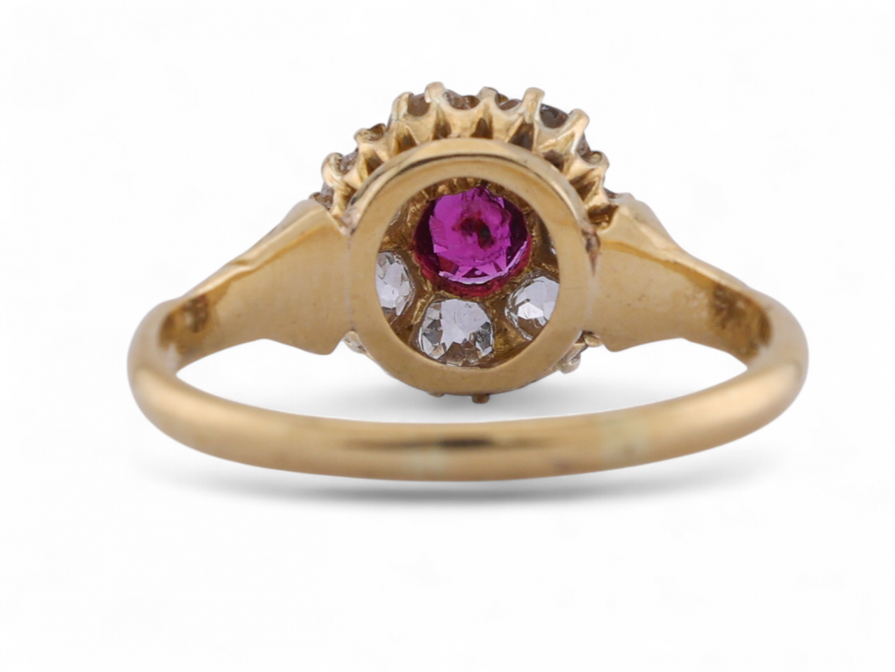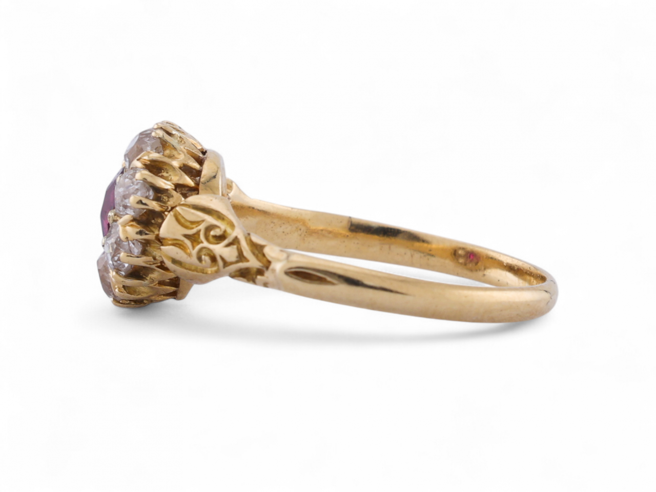 Centred with a cushion cut ruby of rich pinkish-red hue, estimated at 0.27ct, claw set within a cluster of eight old mine cut diamonds in scalloped claw settings, estimated total diamond weight 0.70ct, I–J colour, SI clarity. The floral cluster design sits in a pierced gallery with stylised fleur-de-lis shoulders tapering to a solid shank. A classic late 19th-century English design displaying warmth, colour contrast, and exceptional period craftsmanship. Tested 18kt gold.