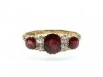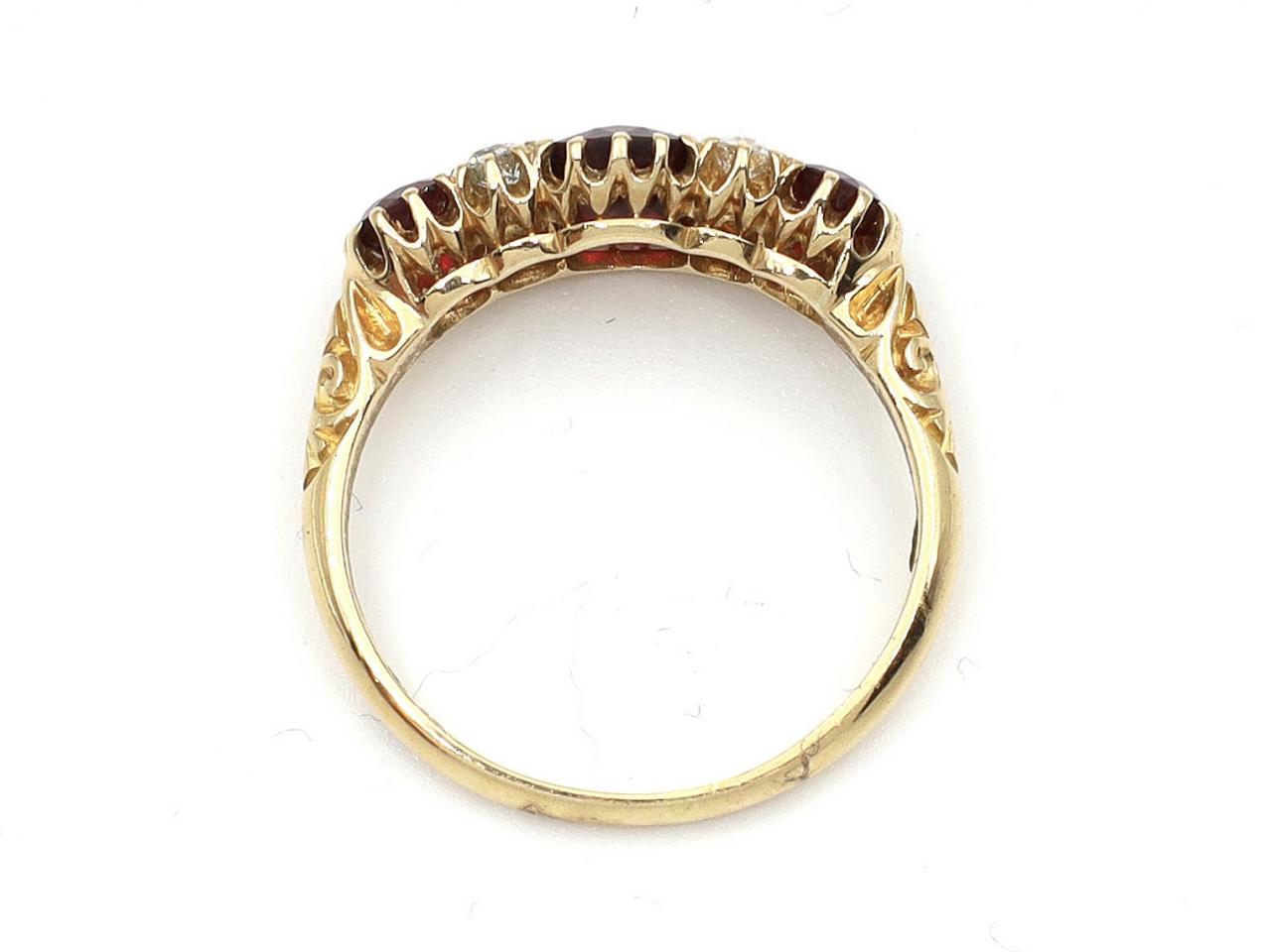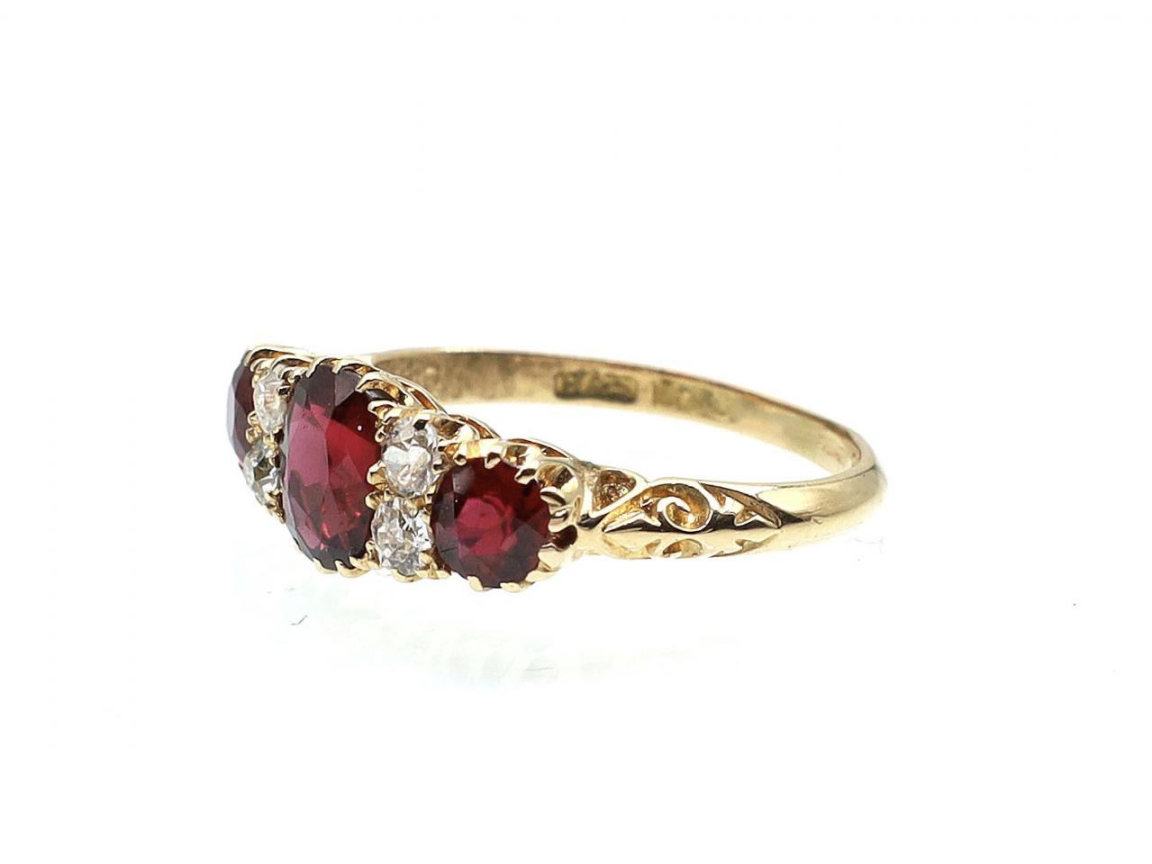 Victorian ruby and diamond three stone carved ring in gold. Set with three graduating oval mixed cut rubies in claw settings, alternating with two vertical rows of old cut diamonds in claw settings, to an ornate three stone design with curving claws, intricately carved gallery which continues to the trumpeting shoulders terminating to a solid shank. Hallmarked 18kt gold.
