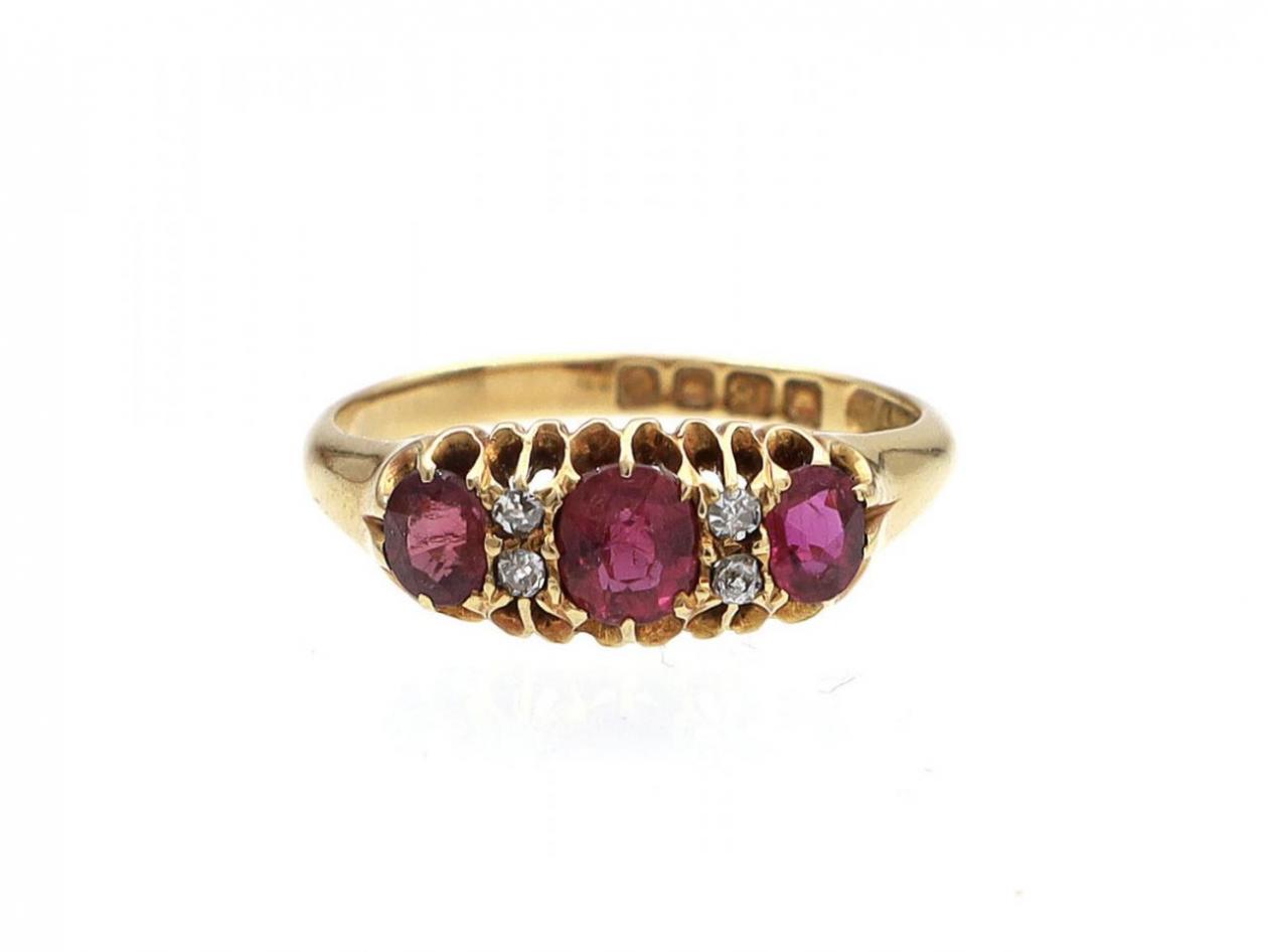 Victorian ruby three stone ring in 18kt yellow gold. Set across the finger with three cushion shape mixed cut rubies in fancy claw settings, embellished with diamond details and flanked by smooth trumpeting shoulders which flow to a solid shank. Hallmarked 18kt gold, London, 1900.