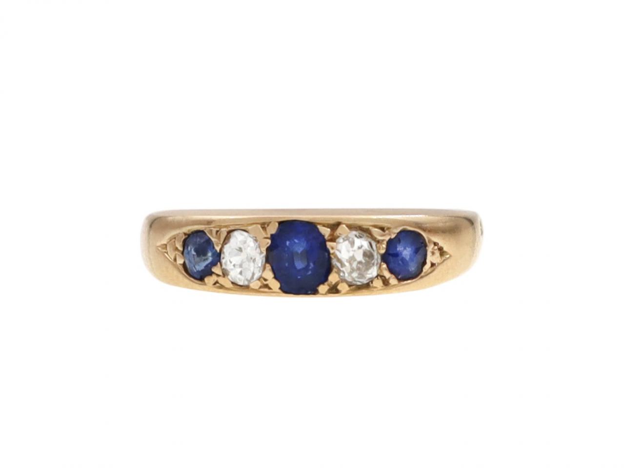 Victorian sapphire and diamond five stone ring in 18kt yellow gold. Centrally set with an oval mixed cut sapphire in a grain setting, flanked to either side with two cushion shape Old Mine cut diamonds in grain settings, further enhanced by two round mixed cut sapphires in grain settings, to a graduating five stone design with polished gallery and integrated shoulders which smooth to a solid shank. Marked 18kt gold.