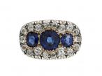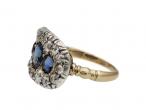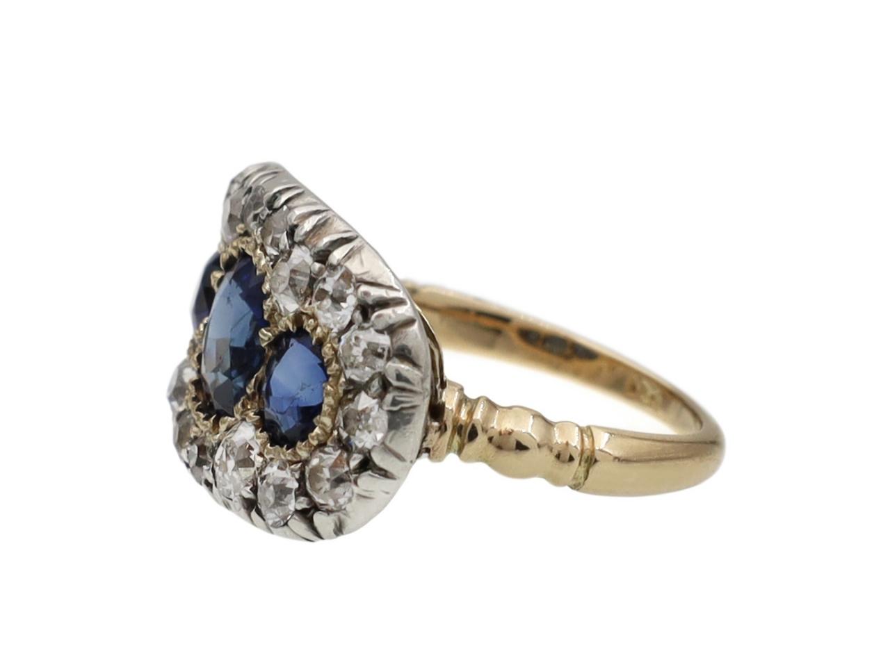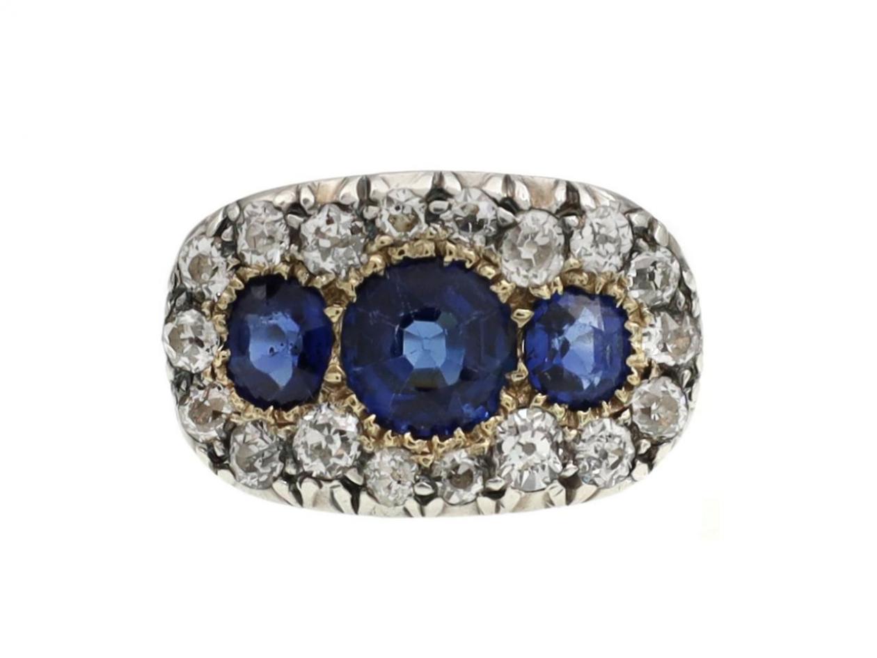 Victorian sapphire and diamond three stone cluster ring in silver and 18kt gold. Centrally set with a round mixed cut sapphire in a yellow gold grain setting, flanked by two cushion shape mixed cut sapphires in yellow gold grain settings, the three sapphires fully encircled by a row of eighteen cushion shape Old Mine diamonds in silver cut down settings, to a horizontal oval plaque ring featuring intricate settings, a pierced scalloped openwork gallery and decorative incised shoulders which smooth to a solid shank. Marked 18kt gold.