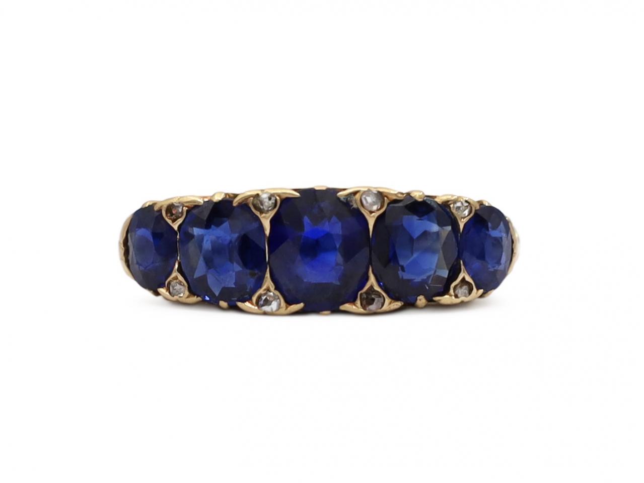 Victorian sapphire five stone carved ring in 18kt yellow gold. Set across the finger with five graduating cushion shape mixed cut sapphires in bespoke claw settings, embellished to top and bottom with eight rose cut diamonds in grain settings, to a five stone ring with intricate claws, pierced scrolling gallery and trumpeting engraved shoulders which terminate and smooth to a solid shank. Estimated total sapphire weight 2.00cts.