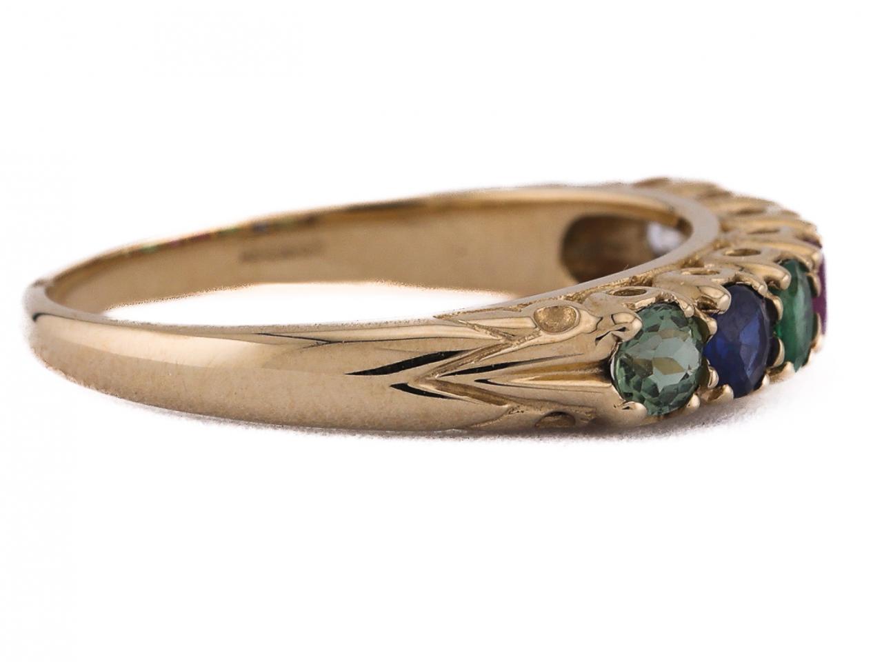Victorian style 'DEAREST ' acrostic ring in 9kt yellow gold. Set across the finger with round mixed cut diamond, amethyst, ruby, sapphire, tourmaline and two emeralds in stylised claw settings, to a seven stone ring with curving claws, pierced gallery and trumpeting shoulders which smooth to a solid shank. Marked 9kt gold.