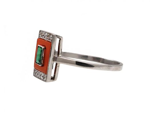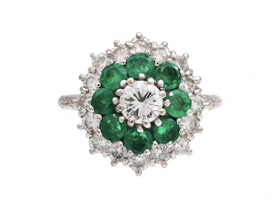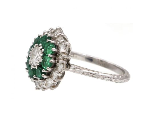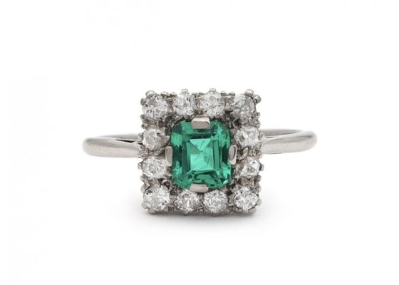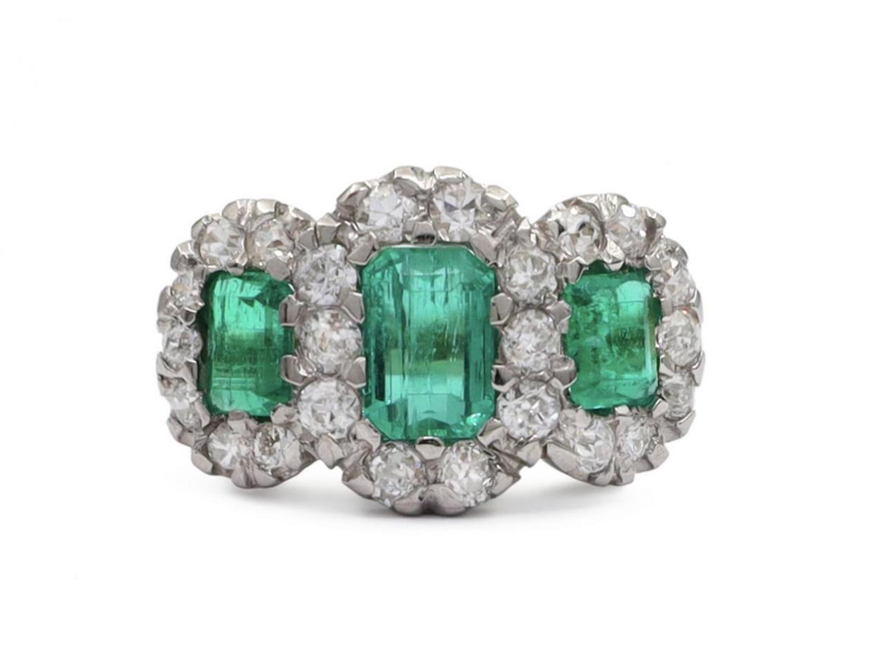 Victorian style emerald and diamond three stone cluster ring in 18kt yellow gold. Set across the finger with three rectangular step cut emeralds in claw settings, each emerald surrounded by a row of round brilliant cut diamonds in claw settings, to a three stone cluster design with curving claws, open gallery supported by cheniers and emt to either side with raised trumpeting shoulders which smooth to a solid shank. Estimated total emerald weight 1.20cts. Estimated total diamond weight 0.80cts.