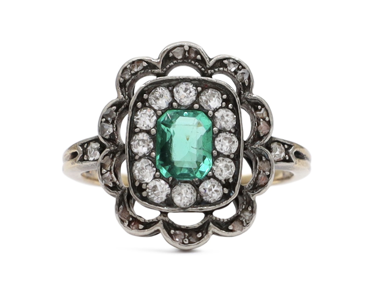 Victorian style emerald and diamond two row cluster ring in silver on 14kt yellow gold. Centred with a octagonal emerald-cut emerald in a silver grain setting, bordered by a row of twelve round old cut diamonds in grain settings, further enhanced by an openwork scalloped frame studded with rose cut diamonds in grain settings, to a pretty fancy cluster ring
