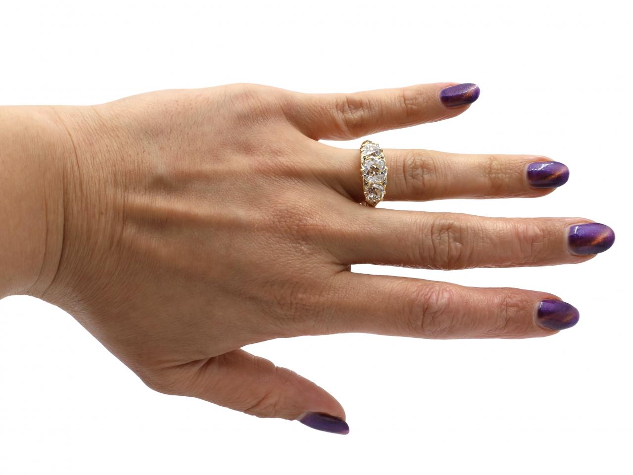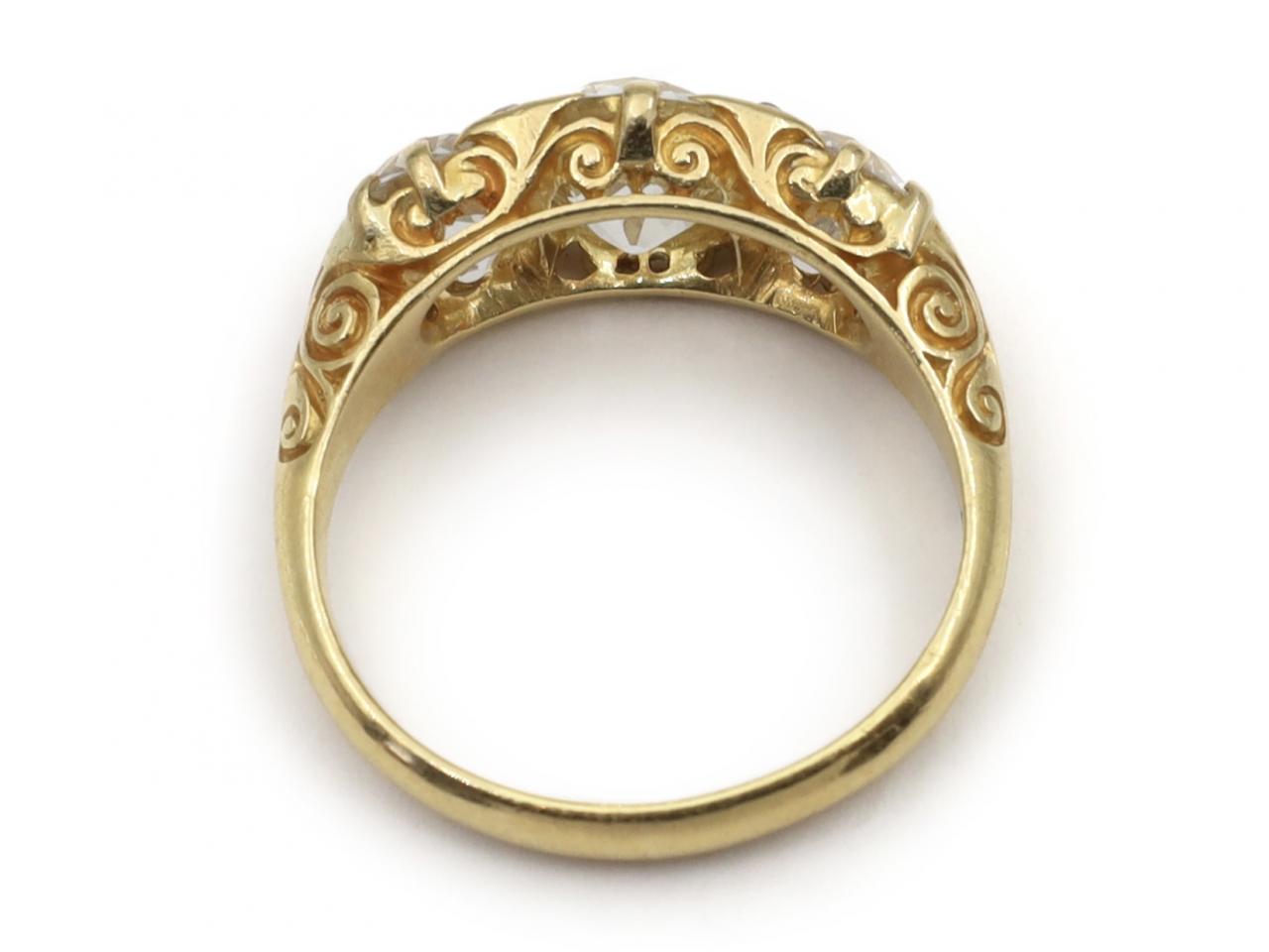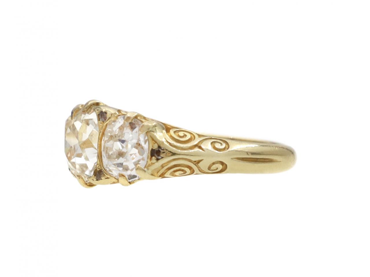 Victorian three stone diamond carved ring in 18kt yellow gold. Centred with an estimated 1.60ct cushion shape Old Mine cut diamond in a claw setting, flanked to either side with two cushion shape Old Mine cut diamonds in claw settings, to a graduating three stone design, embellished with rose cut diamond accents, fine claw settings, intricately carved scrolling gallery and shoulders which smooth to a solid shank. Estimated total diamond weight 3.40cts. Hallmarked 18kt gold, London, 1888.