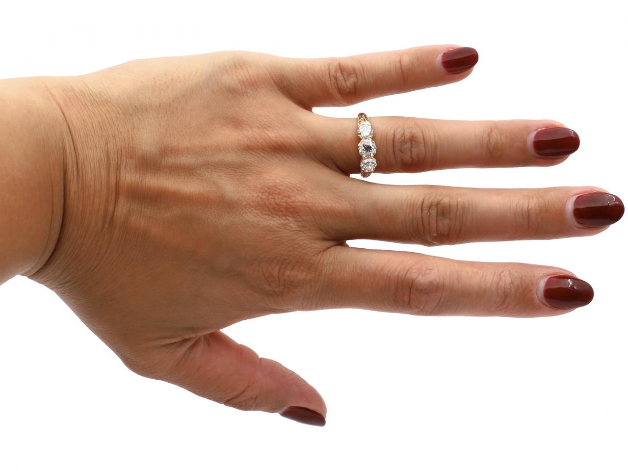 Victorian three stone diamond carved ring in 18kt yellow gold. Set across the finger with three round old European cut diamonds in claw settings, to a traditional three stone design with bespoke claws, intricately carved gallery and shoulders which curve and smooth to a solid shank.