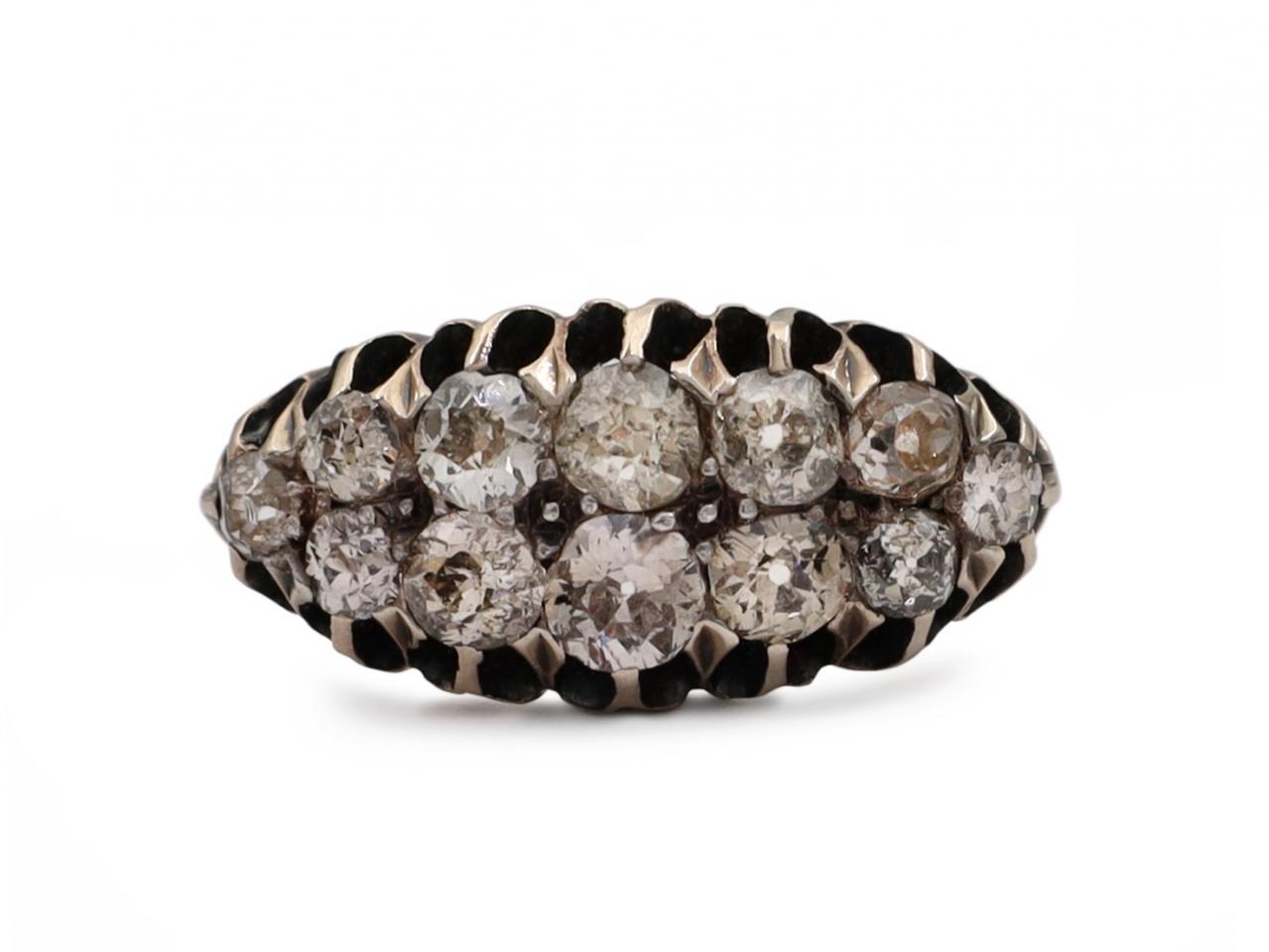 Victorian tinted brown diamond navette cluster ring in 18kt gold. Set across the finger with twelve cushion shape Old Mine cut tinted brown diamonds in claw settings, to a cluster design featuring curving claws, ribbed openwork gallery and met to either side with carved trumpeting shoulders which smooth to a solid shank. Estimated total diamond weight 1.80cts. Marked 18kt gold. Numbered '218'.