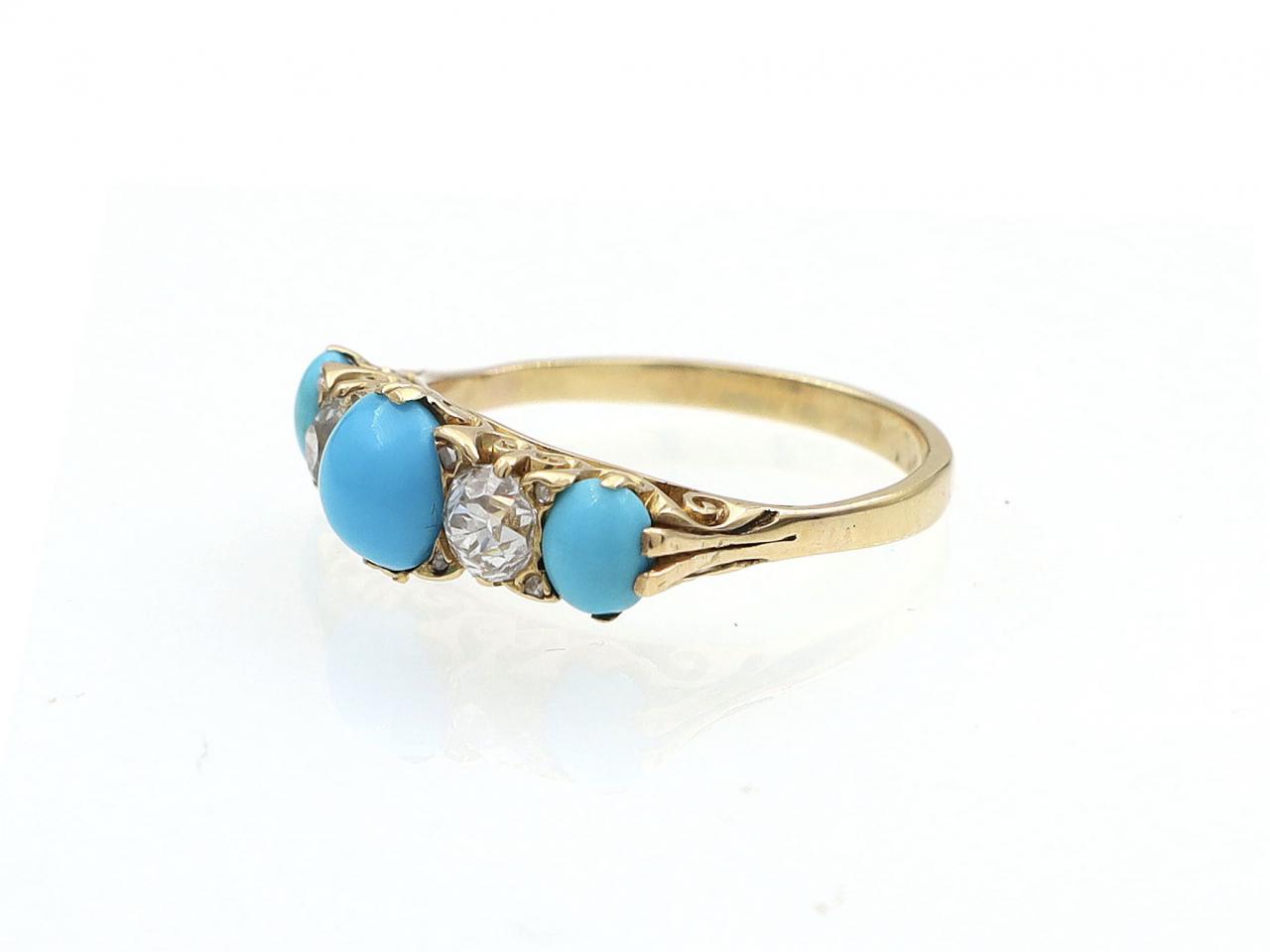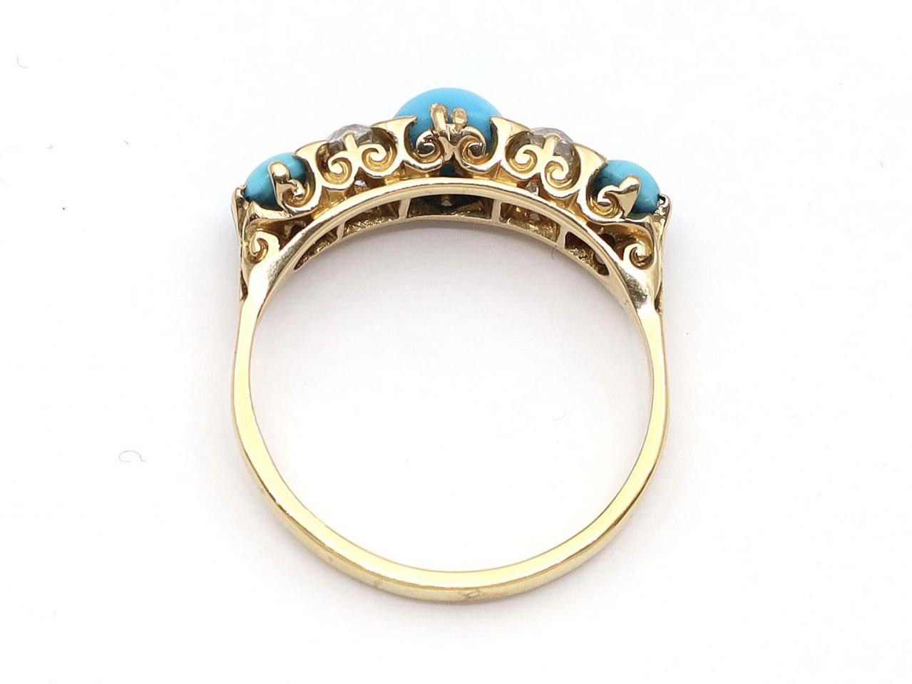 Victorian turquoise and diamond five stone carved ring in 18kt yellow gold. Centred with a round cabochon cut Persian turquoise in a stylised claw setting, flanked to either side with two cushion shape Old Mine cut diamonds in claw settings, further set with two round cabochon cut Persian turquoise in claw settings, to an elaborate half hoop five stone ring with a carved scrolling gallery, the trumpeting shoulders feature decorative engraving before smoothing to a solid shank.