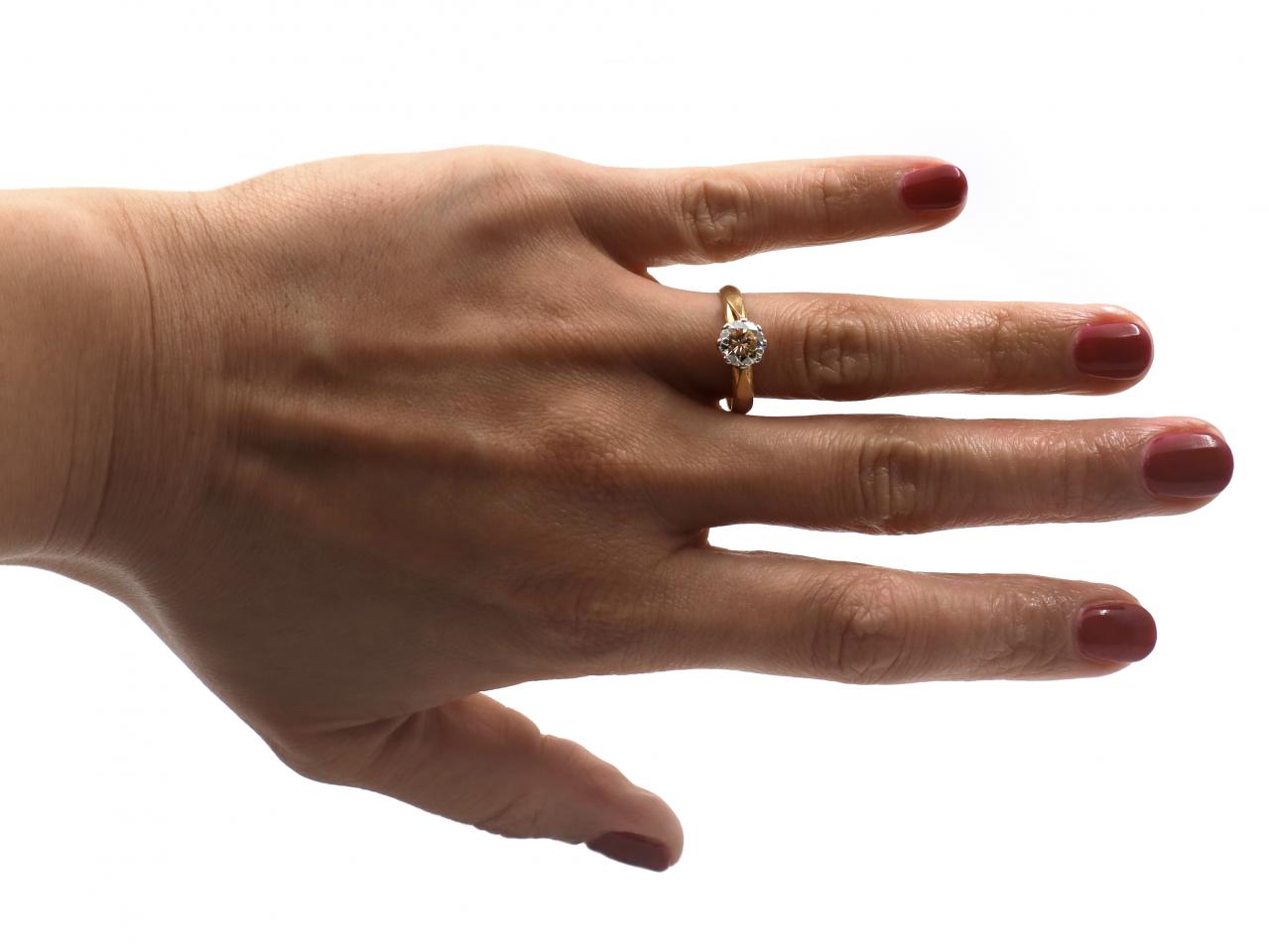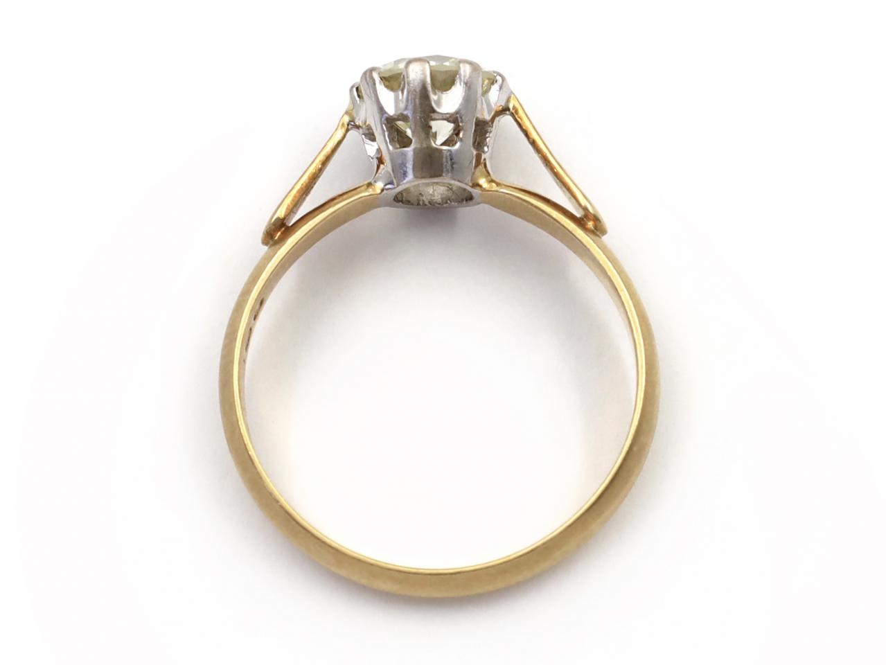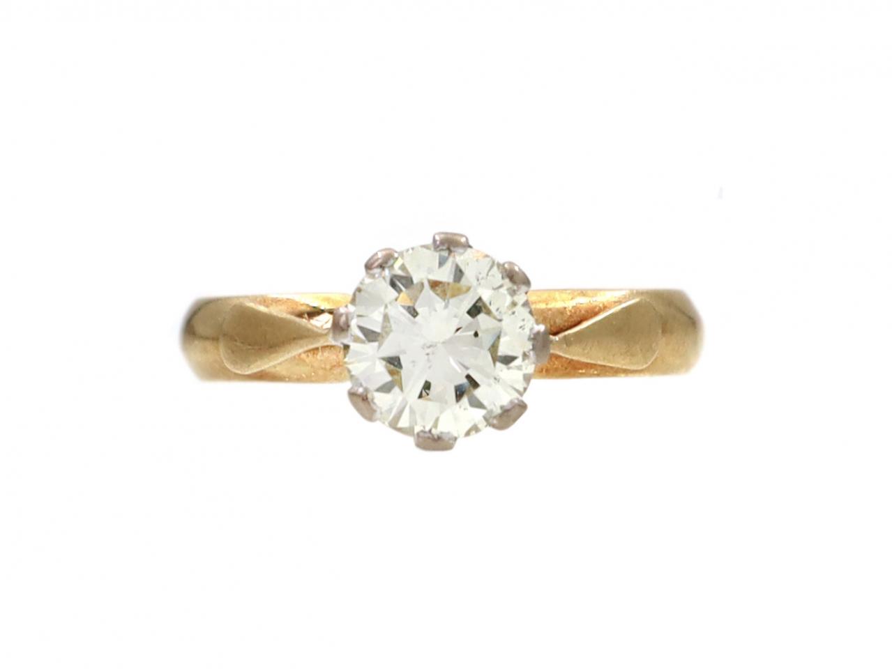 Vintage 1.15ct diamond solitaire engagement ring in 18kt yellow gold. Set with an estimated 1.15ct round brilliant cut diamond in a raised claw setting, to a classic solitaire design with pierced platinum collet, bespoke claws and raised pointed terminals which connect to a solid shank. Hallmarked 18kt gold, Dublin, 1978.