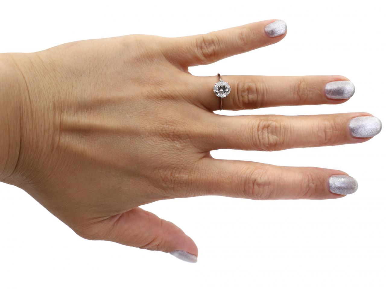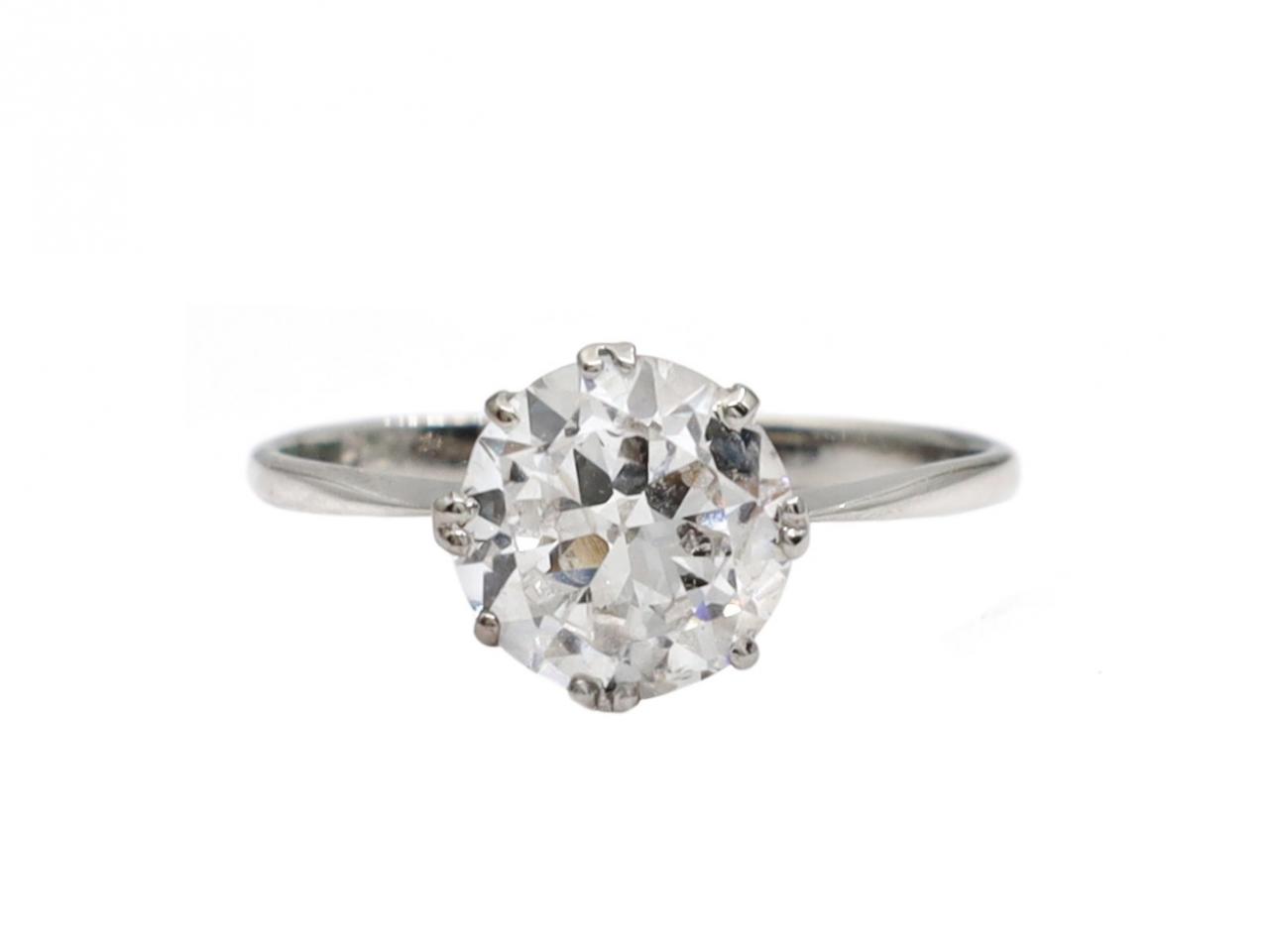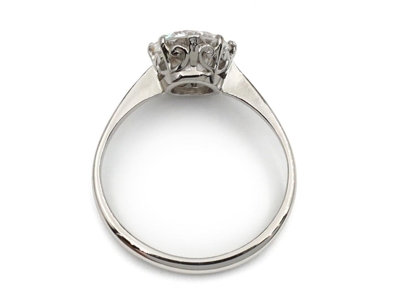 Vintage 1.65ct diamond solitaire engagement ring in platinum. Set with an estimated 1.65ct round brilliant cut diamond in a split claw setting, to a classic solitaire design with pierced scrolling collet and curving claws, met to either side with raised inwardly tapering shoulders which smooth to a solid shank. Marked platinum.