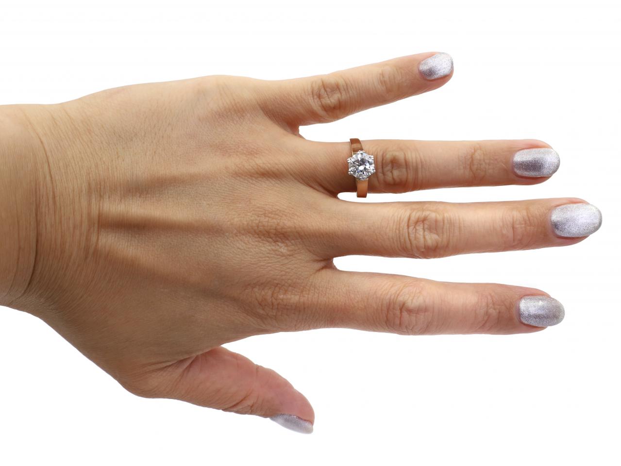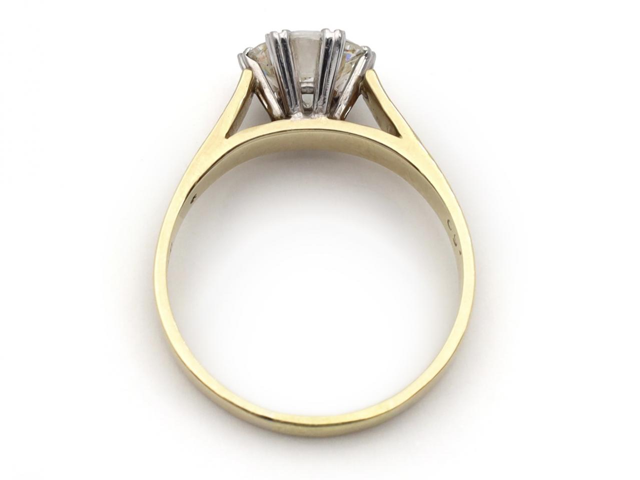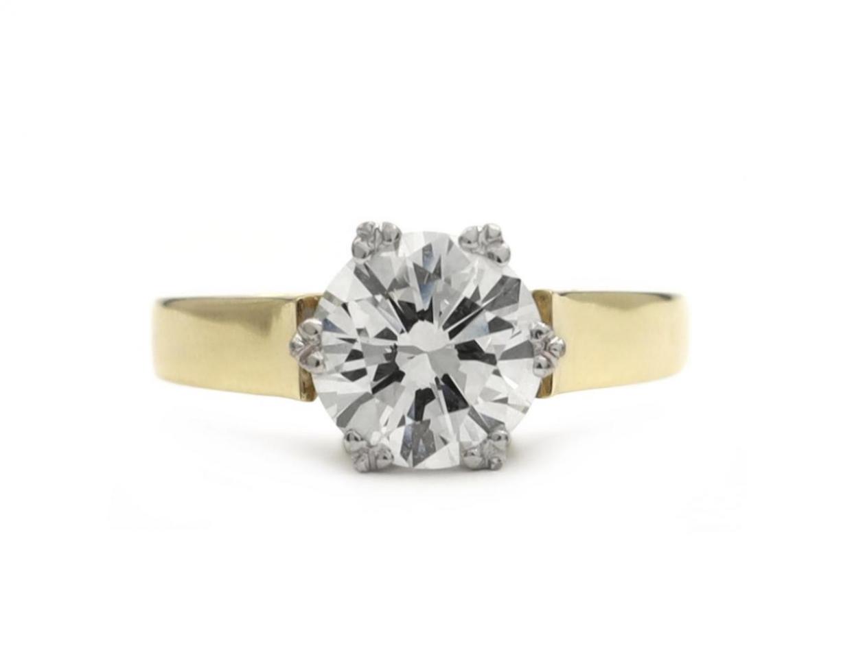 Vintage 1.60ct round brilliant cut diamond solitaire engagement ring in 18kt yellow gold. Centred with a 1.60ct round brilliant cut diamond, J colour, in a fancy claw setting, to a traditional solitaire design featuring tri-ribbed claws, openwork collet and met to either side with raised slightly trumpeting shoulders which curve to a solid shank. Accompanied by HRD Antwerp certificate.